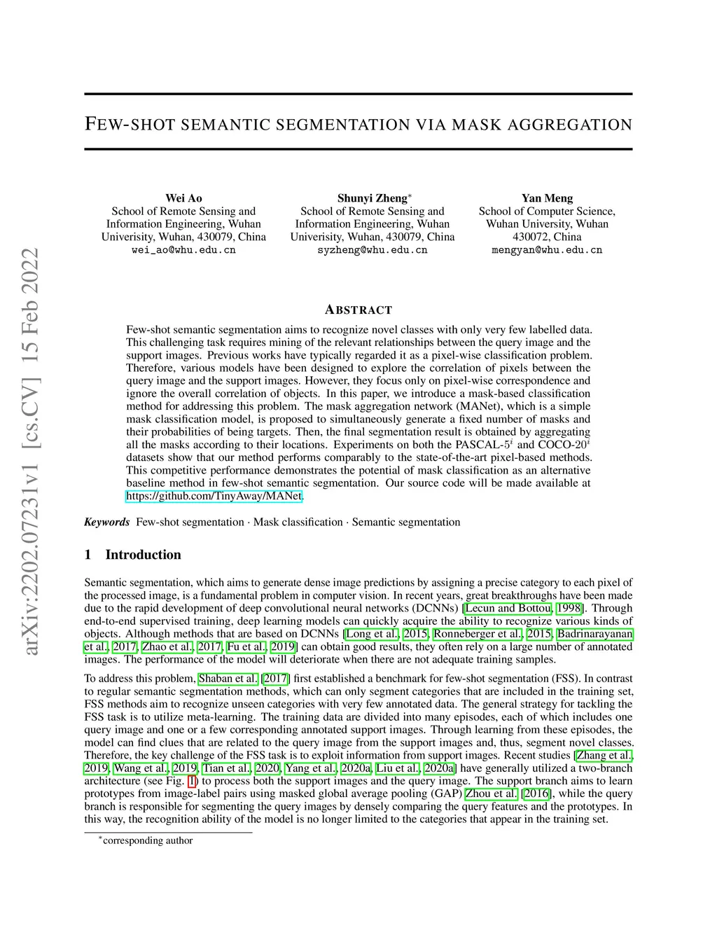 Few-shot semantic segmentation aims to recognize novel classes with only very few labelled data. This challenging task requires mining of the relevant relationships between the query image and the support images. Previous works have typically regarded it as a pixel-wise classification problem. Therefore, various models have been designed to explore the correlation of pixels between the query image and the support images. However, they focus only on pixel-wise correspondence and ignore the overall correlation of objects. In this paper, we introduce a mask-based classification method for addressing this problem. The mask aggregation network (MANet), which is a simple mask classification model, is proposed to simultaneously generate a fixed number of masks and their probabilities of being targets. Then, the final segmentation result is obtained by aggregating all the masks according to their locations. Experiments on both the PASCAL-5^i and COCO-20^i datasets show that our method performs comparably to the state-of-the-art pixel-based methods. This competitive performance demonstrates the potential of mask classification as an alternative baseline method in few-shot semantic segmentation. Our source code will be made available at https://github.com/TinyAway/MANet.