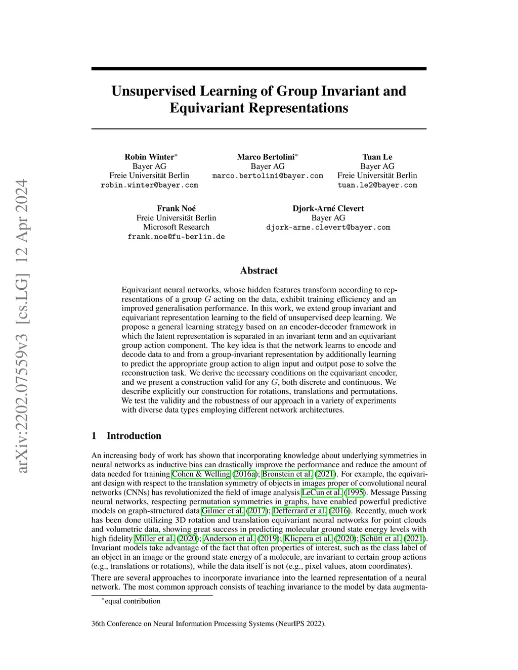 Unsupervised Learning of Group Invariant and Equivariant Representations