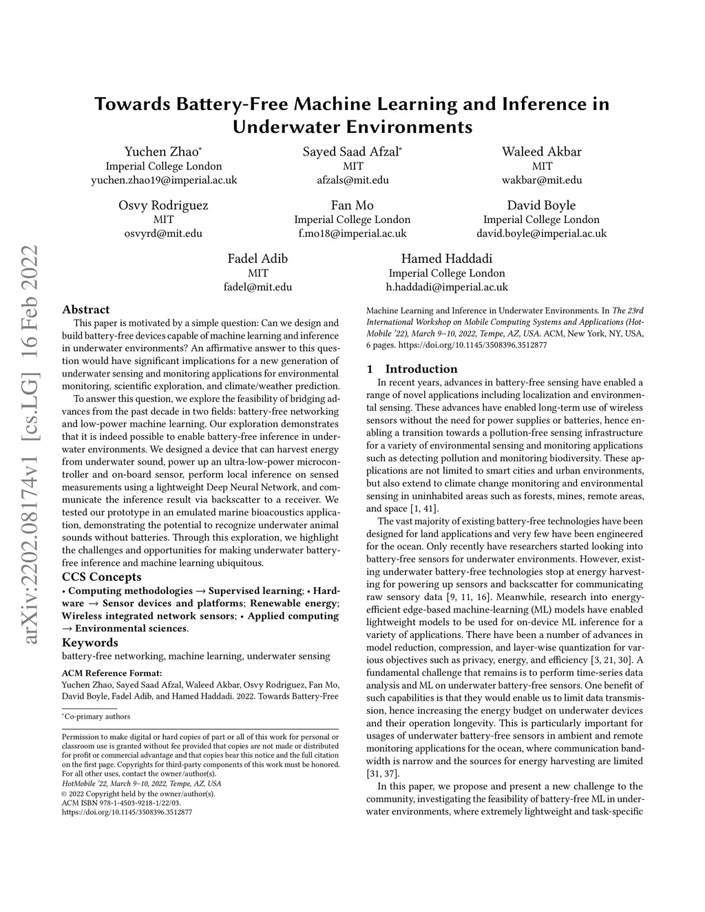 Towards Battery-Free Machine Learning and Inference in Underwater