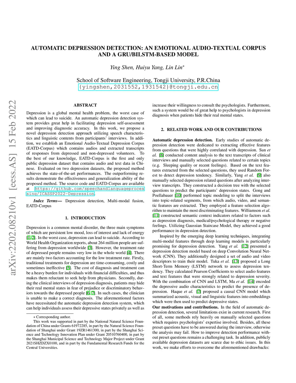 Depression is a global mental health problem, the worst case of which can lead to suicide. An automatic depression detection system provides great help in facilitating depression self-assessment and improving diagnostic accuracy. In this work, we propose a novel depression detection approach utilizing speech characteristics and linguistic contents from participants' interviews. In addition, we establish an Emotional Audio-Textual Depression Corpus (EATD-Corpus) which contains audios and extracted transcripts of responses from depressed and non-depressed volunteers. To the best of our knowledge, EATD-Corpus is the first and only public depression dataset that contains audio and text data in Chinese. Evaluated on two depression datasets, the proposed method achieves the state-of-the-art performances. The outperforming results demonstrate the effectiveness and generalization ability of the proposed method. The source code and EATD-Corpus are available at https://github.com/speechandlanguageprocessing/ICASSP2022-Depression.