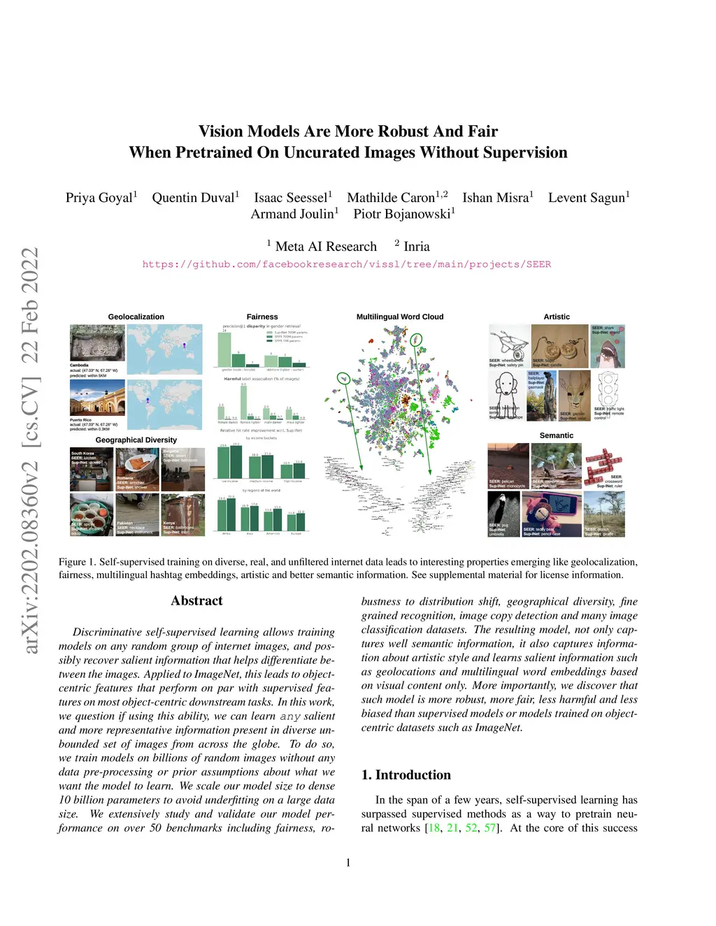 Discriminative self-supervised learning allows training models on any random group of internet images, and possibly recover salient information that helps differentiate between the images. Applied to ImageNet, this leads to object centric features that perform on par with supervised features on most object-centric downstream tasks. In this work, we question if using this ability, we can learn any salient and more representative information present in diverse unbounded set of images from across the globe. To do so, we train models on billions of random images without any data pre-processing or prior assumptions about what we want the model to learn. We scale our model size to dense 10 billion parameters to avoid underfitting on a large data size. We extensively study and validate our model performance on over 50 benchmarks including fairness, robustness to distribution shift, geographical diversity, fine grained recognition, image copy detection and many image classification datasets. The resulting model, not only captures well semantic information, it also captures information about artistic style and learns salient information such as geolocations and multilingual word embeddings based on visual content only. More importantly, we discover that such model is more robust, more fair, less harmful and less biased than supervised models or models trained on object centric datasets such as ImageNet.