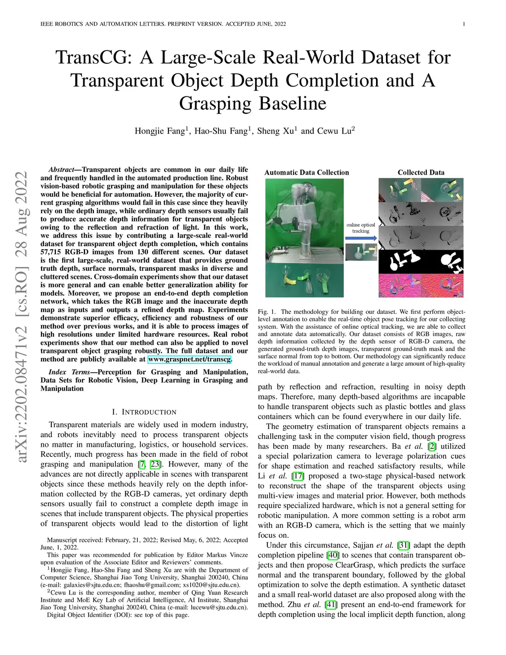 Transparent objects are common in our daily life and frequently handled in the automated production line. Robust vision-based robotic grasping and manipulation for these objects would be beneficial for automation. However, the majority of current grasping algorithms would fail in this case since they heavily rely on the depth image, while ordinary depth sensors usually fail to produce accurate depth information for transparent objects owing to the reflection and refraction of light. In this work, we address this issue by contributing a large-scale real-world dataset for transparent object depth completion, which contains 57,715 RGB-D images from 130 different scenes. Our dataset is the first large-scale, real-world dataset that provides ground truth depth, surface normals, transparent masks in diverse and cluttered scenes. Cross-domain experiments show that our dataset is more general and can enable better generalization ability for models. Moreover, we propose an end-to-end depth completion network, which takes the RGB image and the inaccurate depth map as inputs and outputs a refined depth map. Experiments demonstrate superior efficacy, efficiency and robustness of our method over previous works, and it is able to process images of high resolutions under limited hardware resources. Real robot experiments show that our method can also be applied to novel transparent object grasping robustly. The full dataset and our method are publicly available at www.graspnet.net/transcg
