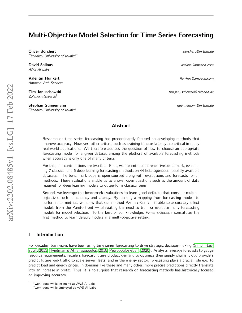Research on time series forecasting has predominantly focused on developing methods that improve accuracy. However, other criteria such as training time or latency are critical in many real-world applications. We therefore address the question of how to choose an appropriate forecasting model for a given dataset among the plethora of available forecasting methods when accuracy is only one of many criteria. For this, our contributions are two-fold. First, we present a comprehensive benchmark, evaluating 7 classical and 6 deep learning forecasting methods on 44 heterogeneous, publicly available datasets. The benchmark code is open-sourced along with evaluations and forecasts for all methods. These evaluations enable us to answer open questions such as the amount of data required for deep learning models to outperform classical ones. Second, we leverage the benchmark evaluations to learn good defaults that consider multiple objectives such as accuracy and latency. By learning a mapping from forecasting models to performance metrics, we show that our method PARETOSELECT is able to accurately select models from the Pareto front -- alleviating the need to train or evaluate many forecasting models for model selection. To the best of our knowledge, PARETOSELECT constitutes the first method to learn default models in a multi-objective setting.