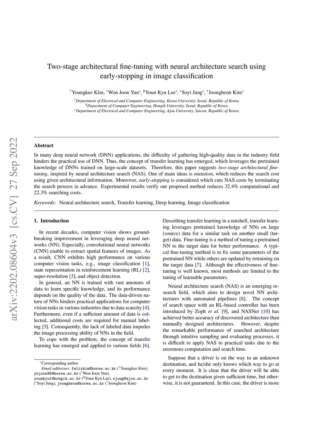 In many deep neural network (DNN) applications, the difficulty of gathering high-quality data in the industry field hinders the practical use of DNN. Thus, the concept of transfer learning has emerged, which leverages the pretrained knowledge of DNNs trained on large-scale datasets. Therefore, this paper suggests two-stage architectural fine-tuning, inspired by neural architecture search (NAS). One of main ideas is mutation, which reduces the search cost using given architectural information. Moreover, early-stopping is considered which cuts NAS costs by terminating the search process in advance. Experimental results verify our proposed method reduces 32.4% computational and 22.3% searching costs.