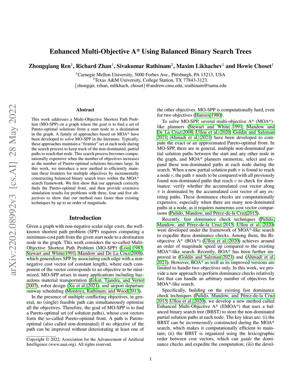 Enhanced Multi-Objective A* Using Balanced Binary Search Trees