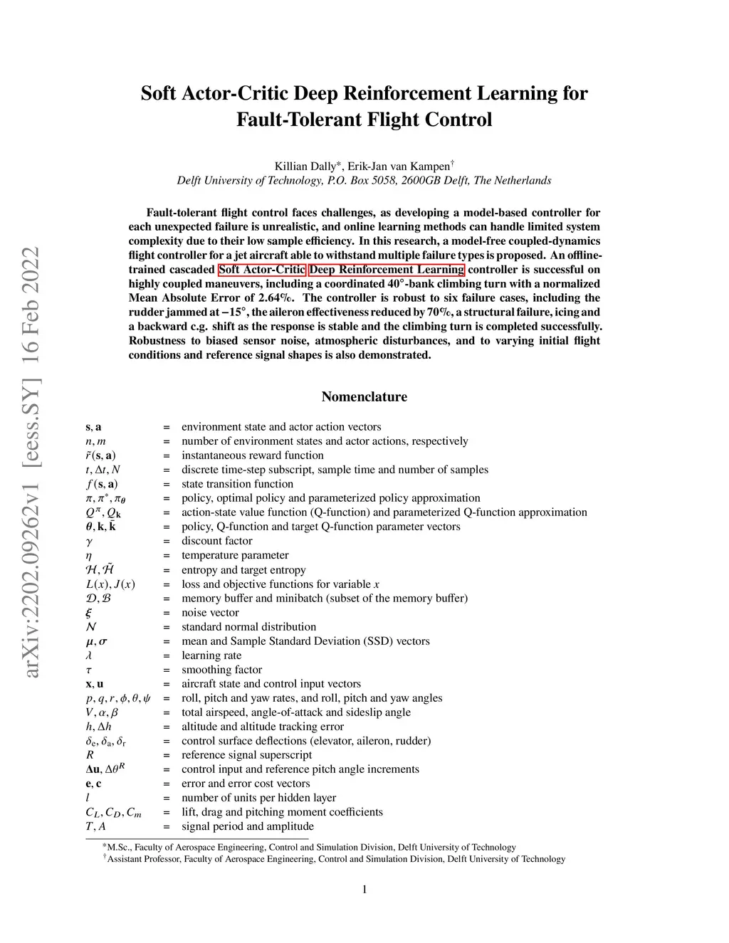 Soft Actor-Critic Deep Reinforcement Learning for Fault Tolerant Flight