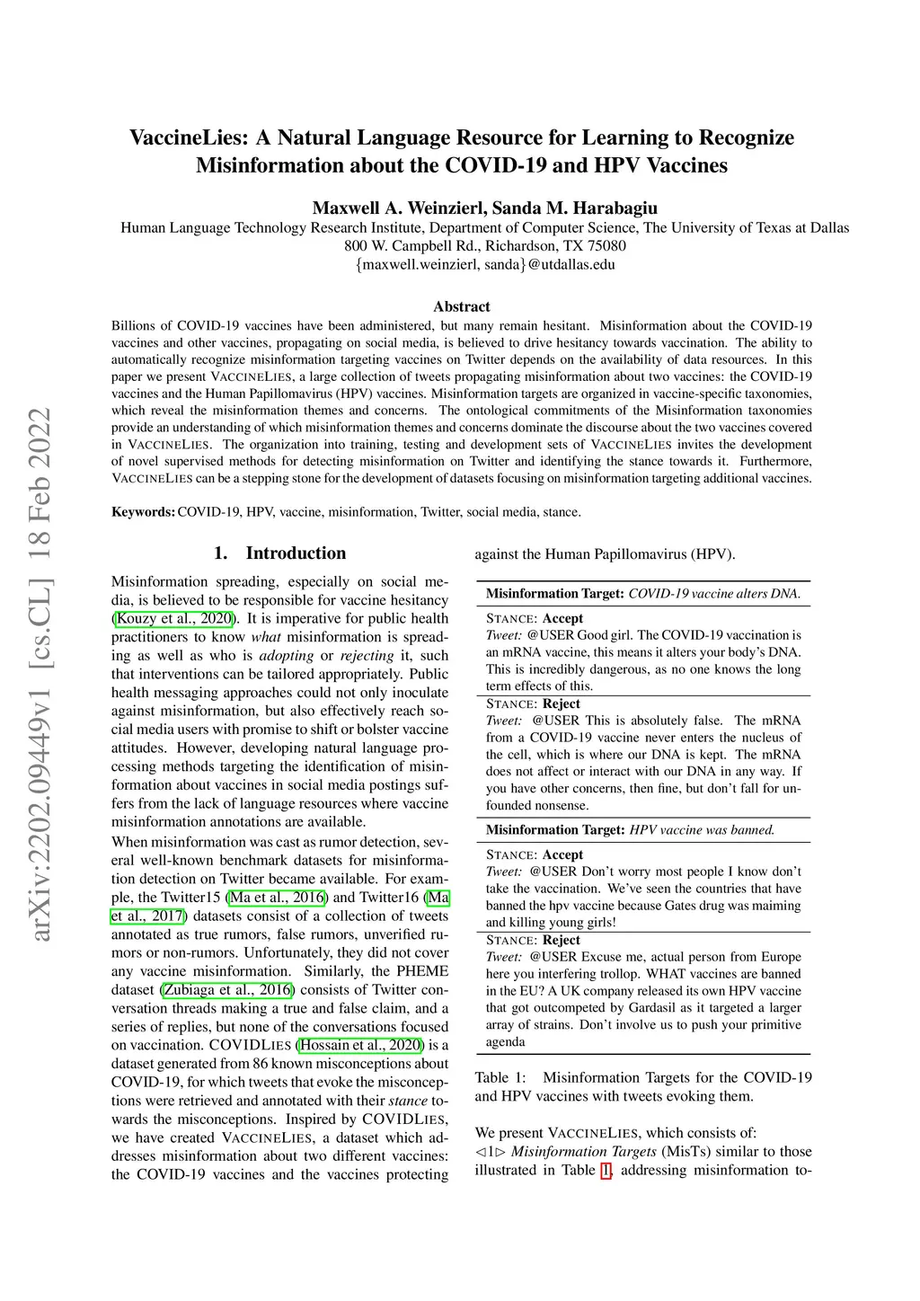 VaccineLies: A Natural Language Resource for Learning to Recognize