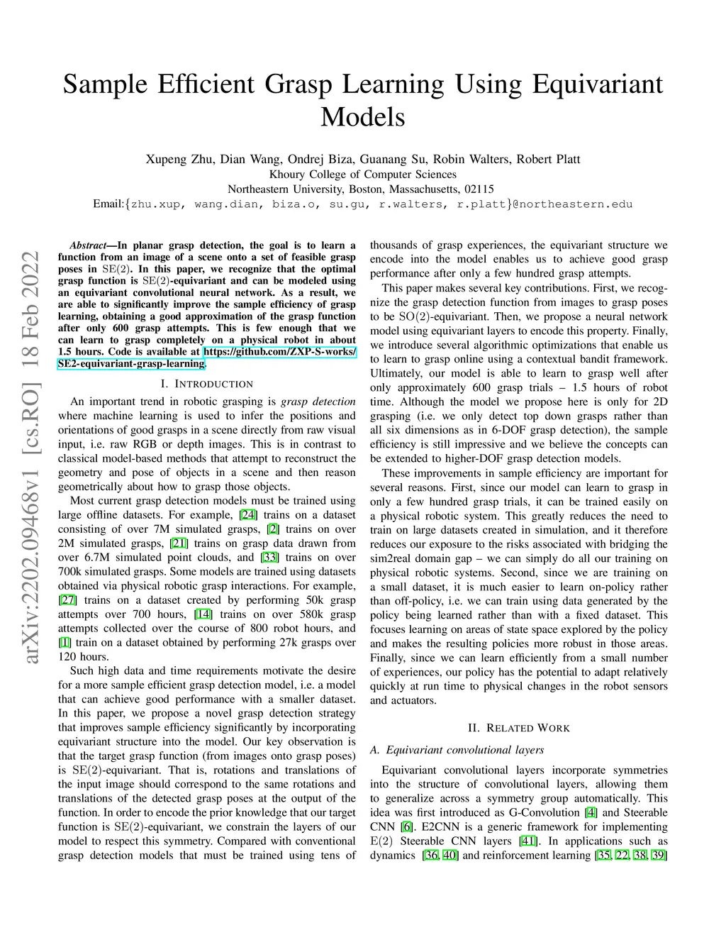 In planar grasp detection, the goal is to learn a function from an image of a scene onto a set of feasible grasp poses in . In this paper, we recognize that the optimal grasp function is -equivariant and can be modeled using an equivariant convolutional neural network. As a result, we are able to significantly improve the sample efficiency of grasp learning, obtaining a good approximation of the grasp function after only 600 grasp attempts. This is few enough that we can learn to grasp completely on a physical robot in about 1.5 hours.