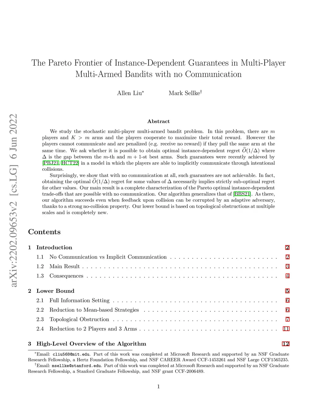 We study the stochastic multi-player multi-armed bandit problem. In this problem, players cooperate to maximize their total reward from arms. However the players cannot communicate and are penalized (e.g. receive no reward) if they pull the same arm at the same time. We ask whether it is possible to obtain optimal instance-dependent regret where is the gap between the -th and -st best arms. Such guarantees were recently achieved in a model allowing the players to implicitly communicate through intentional collisions. Surprisingly, we show that with no communication at all, such guarantees are not achievable. In fact, obtaining the optimal regret for some values of necessarily implies strictly sub-optimal regret in other regimes. Our main result is a complete characterization of the Pareto optimal instance-dependent trade-offs that are possible with no communication. Our algorithm generalizes that of Bubeck, Budzinski, and the second author. As there, our algorithm succeeds even when feedback upon collision can be corrupted by an adaptive adversary, thanks to a strong no-collision property. Our lower bound is based on topological obstructions at multiple scales and is completely new.