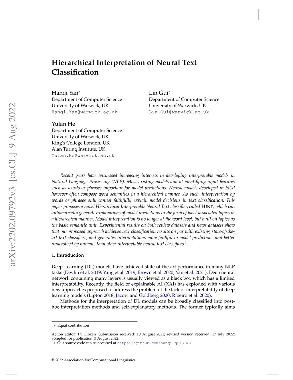 Hierarchical Interpretation of Neural Text Classification