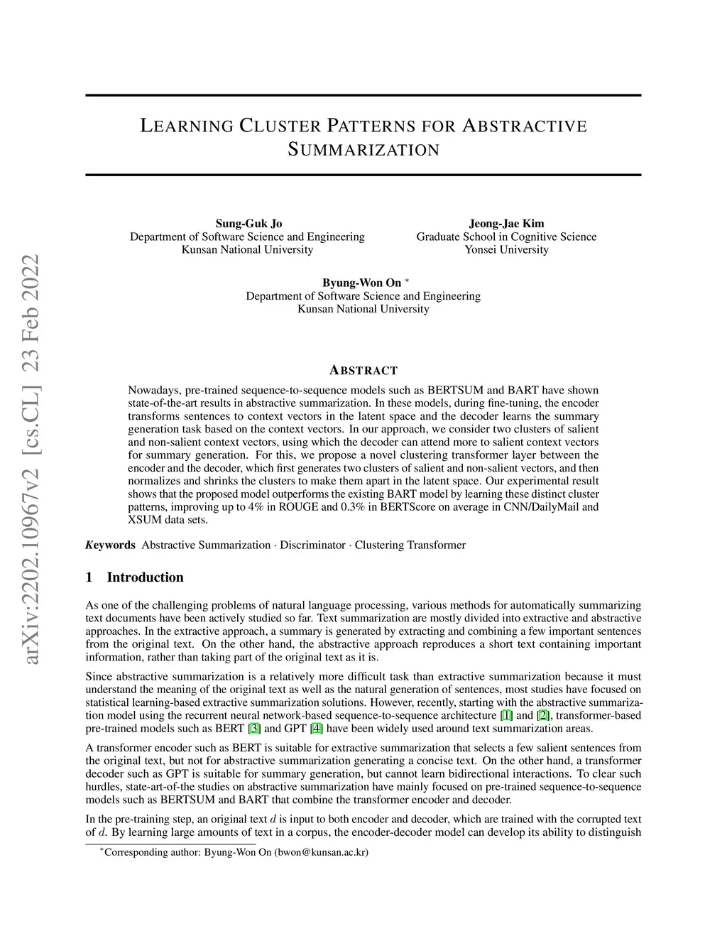 Nowadays, pre-trained sequence-to-sequence models such as BERTSUM and BART have shown state-of-the-art results in abstractive summarization. In these models, during fine-tuning, the encoder transforms sentences to context vectors in the latent space and the decoder learns the summary generation task based on the context vectors. In our approach, we consider two clusters of salient and non-salient context vectors, using which the decoder can attend more to salient context vectors for summary generation. For this, we propose a novel clustering transformer layer between the encoder and the decoder, which first generates two clusters of salient and non-salient vectors, and then normalizes and shrinks the clusters to make them apart in the latent space. Our experimental result shows that the proposed model outperforms the existing BART model by learning these distinct cluster patterns, improving up to 4% in ROUGE and 0.3% in BERTScore on average in CNN/DailyMail and XSUM data sets.