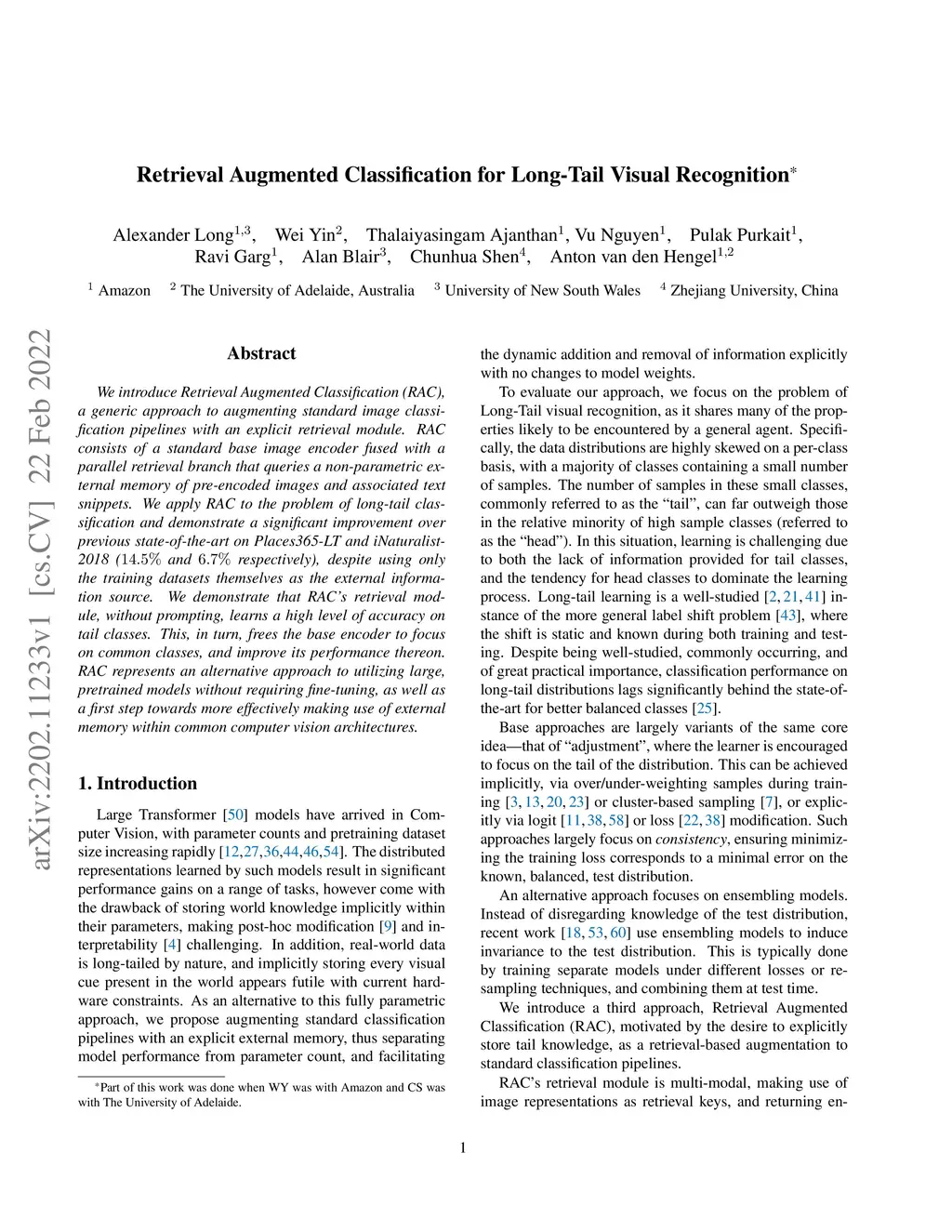 We introduce Retrieval Augmented Classification (RAC), a generic approach to augmenting standard image classification pipelines with an explicit retrieval module. RAC consists of a standard base image encoder fused with a parallel retrieval branch that queries a non-parametric external memory of pre-encoded images and associated text snippets. We apply RAC to the problem of long-tail classification and demonstrate a significant improvement over previous state-of-the-art on Places365-LT and iNaturalist-2018 (14.5% and 6.7% respectively), despite using only the training datasets themselves as the external information source. We demonstrate that RAC's retrieval module, without prompting, learns a high level of accuracy on tail classes. This, in turn, frees the base encoder to focus on common classes, and improve its performance thereon. RAC represents an alternative approach to utilizing large, pretrained models without requiring fine-tuning, as well as a first step towards more effectively making use of external memory within common computer vision architectures.