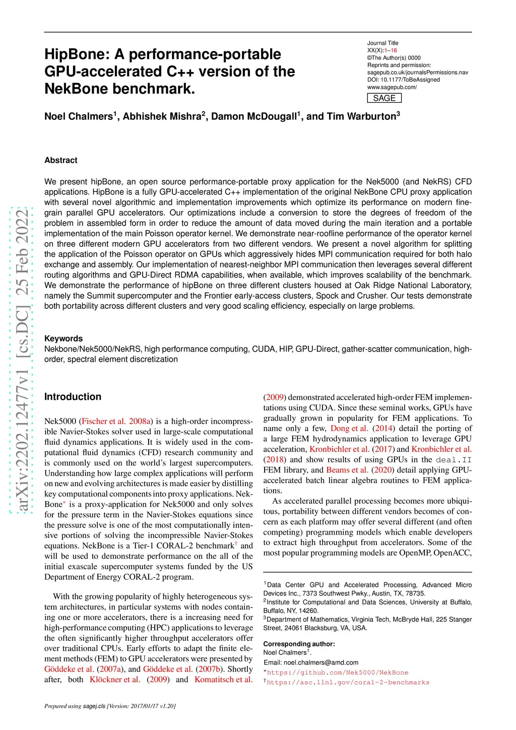 We present hipBone, an open source performance-portable proxy application for the Nek5000 (and NekRS) CFD applications. HipBone is a fully GPU-accelerated C++ implementation of the original NekBone CPU proxy application with several novel algorithmic and implementation improvements which optimize its performance on modern fine-grain parallel GPU accelerators. Our optimizations include a conversion to store the degrees of freedom of the problem in assembled form in order to reduce the amount of data moved during the main iteration and a portable implementation of the main Poisson operator kernel. We demonstrate near-roofline performance of the operator kernel on three different modern GPU accelerators from two different vendors. We present a novel algorithm for splitting the application of the Poisson operator on GPUs which aggressively hides MPI communication required for both halo exchange and assembly. Our implementation of nearest-neighbor MPI communication then leverages several different routing algorithms and GPU-Direct RDMA capabilities, when available, which improves scalability of the benchmark. We demonstrate the performance of hipBone on three different clusters housed at Oak Ridge National Laboratory, namely the Summit supercomputer and the Frontier early-access clusters, Spock and Crusher. Our tests demonstrate both portability across different clusters and very good scaling efficiency, especially on large problems.