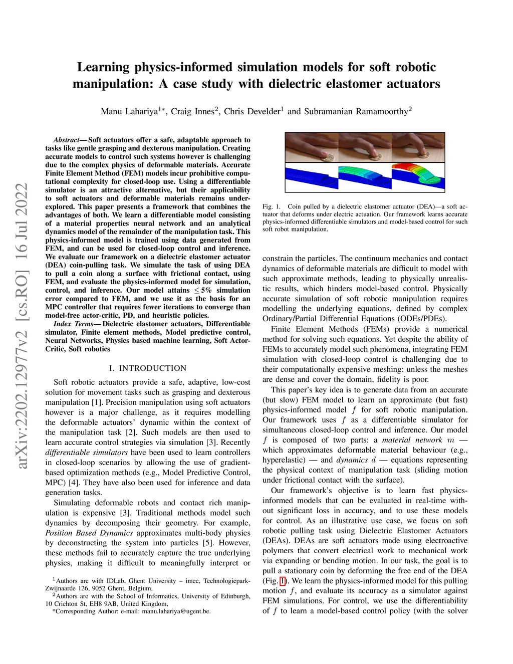 Soft actuators offer a safe, adaptable approach to tasks like gentle grasping and dexterous manipulation. Creating accurate models to control such systems however is challenging due to the complex physics of deformable materials. Accurate Finite Element Method (FEM) models incur prohibitive computational complexity for closed-loop use. Using a differentiable simulator is an attractive alternative, but their applicability to soft actuators and deformable materials remains underexplored. This paper presents a framework that combines the advantages of both. We learn a differentiable model consisting of a material properties neural network and an analytical dynamics model of the remainder of the manipulation task. This physics-informed model is trained using data generated from FEM, and can be used for closed-loop control and inference. We evaluate our framework on a dielectric elastomer actuator (DEA) coin-pulling task. We simulate the task of using DEA to pull a coin along a surface with frictional contact, using FEM, and evaluate the physics-informed model for simulation, control, and inference. Our model attains < 5% simulation error compared to FEM, and we use it as the basis for an MPC controller that requires fewer iterations to converge than model-free actor-critic, PD, and heuristic policies.