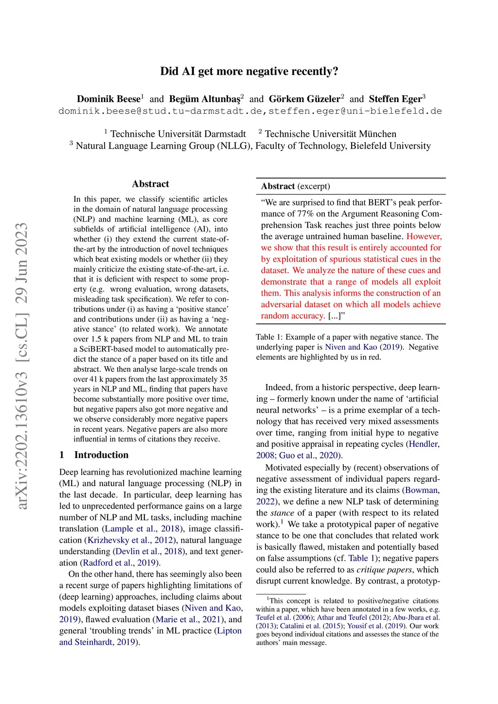 In this paper, we classify scientific articles in the domain of natural language processing (NLP) and machine learning (ML), as core subfields of artificial intelligence (AI), into whether (i) they extend the current state-of-the-art by the introduction of novel techniques which beat existing models or whether (ii) they mainly criticize the existing state-of-the-art, i.e. that it is deficient with respect to some property (e.g. wrong evaluation, wrong datasets, misleading task specification). We refer to contributions under (i) as having a 'positive stance' and contributions under (ii) as having a ñegative stance' (to related work). We annotate over 1.5 k papers from NLP and ML to train a SciBERT-based model to automatically predict the stance of a paper based on its title and abstract. We then analyse large-scale trends on over 41 k papers from the last approximately 35 years in NLP and ML, finding that papers have become substantially more positive over time, but negative papers also got more negative and we observe considerably more negative papers in recent years. Negative papers are also more influential in terms of citations they receive.
