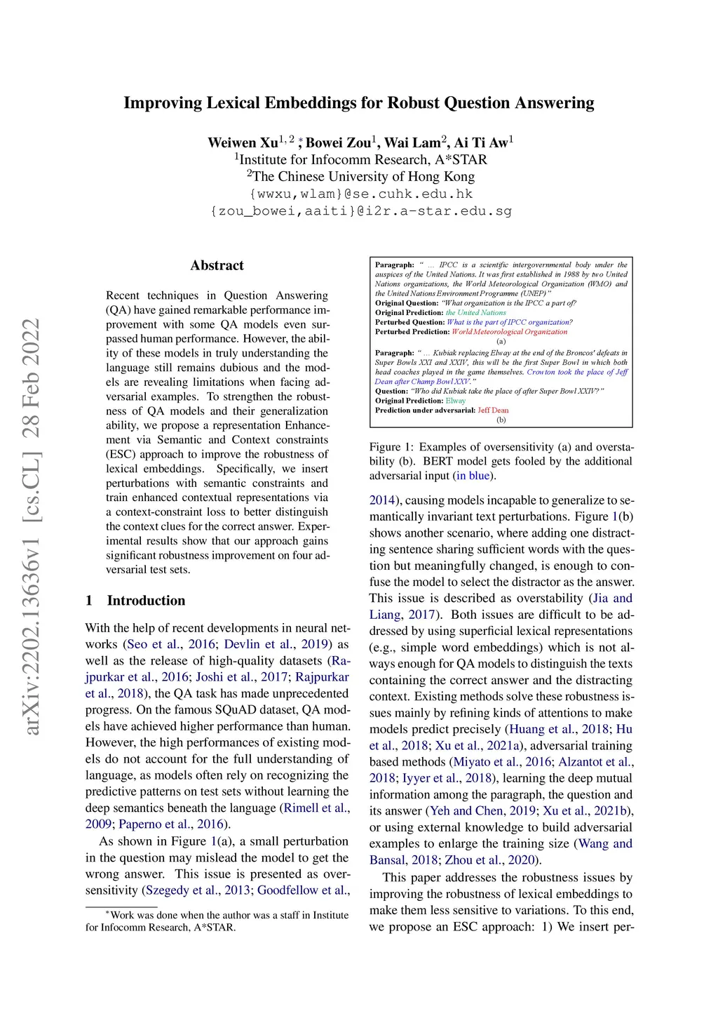 Recent techniques in Question Answering (QA) have gained remarkable performance improvement with some QA models even surpassed human performance. However, the ability of these models in truly understanding the language still remains dubious and the models are revealing limitations when facing adversarial examples. To strengthen the robustness of QA models and their generalization ability, we propose a representation Enhancement via Semantic and Context constraints (ESC) approach to improve the robustness of lexical embeddings. Specifically, we insert perturbations with semantic constraints and train enhanced contextual representations via a context-constraint loss to better distinguish the context clues for the correct answer. Experimental results show that our approach gains significant robustness improvement on four adversarial test sets.