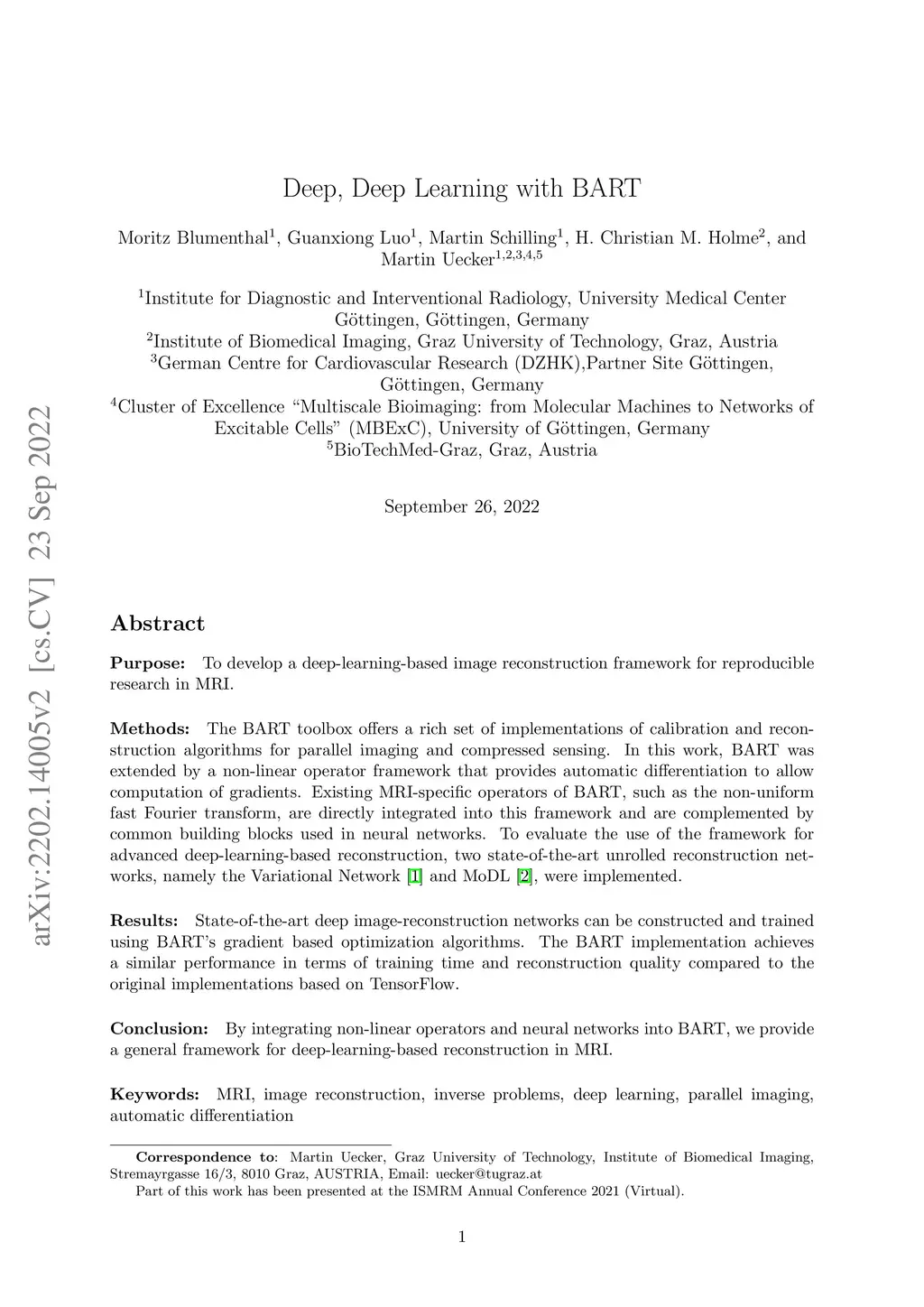 Purpose: To develop a deep-learning-based image reconstruction framework for reproducible research in MRI. Methods: The BART toolbox offers a rich set of implementations of calibration and reconstruction algorithms for parallel imaging and compressed sensing. In this work, BART was extended by a non-linear operator framework that provides automatic differentiation to allow computation of gradients. Existing MRI-specific operators of BART, such as the non-uniform fast Fourier transform, are directly integrated into this framework and are complemented by common building blocks used in neural networks. To evaluate the use of the framework for advanced deep-learning-based reconstruction, two state-of-the-art unrolled reconstruction networks, namely the Variational Network [1] and MoDL [2], were implemented. Results: State-of-the-art deep image-reconstruction networks can be constructed and trained using BART's gradient based optimization algorithms. The BART implementation achieves a similar performance in terms of training time and reconstruction quality compared to the original implementations based on TensorFlow. Conclusion: By integrating non-linear operators and neural networks into BART, we provide a general framework for deep-learning-based reconstruction in MRI.