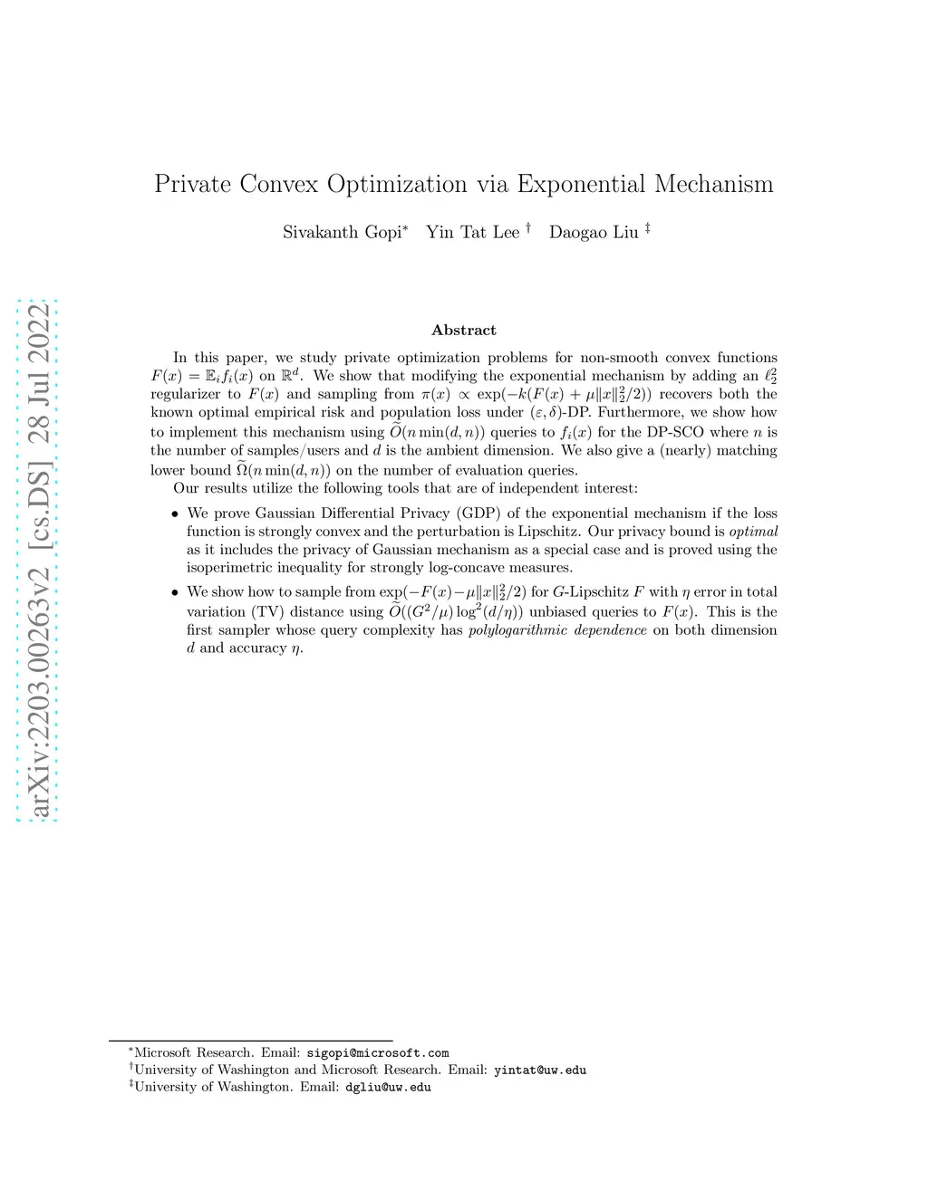 In this paper, we study private optimization problems for non-smooth convex functions on . We show that modifying the exponential mechanism by adding an regularizer to and sampling from recovers both the known optimal empirical risk and population loss under -DP. Furthermore, we show how to implement this mechanism using queries to for the DP-SCO where is the number of samples/users and is the ambient dimension. We also give a (nearly) matching lower bound on the number of evaluation queries. Our results utilize the following tools that are of independent interest: (1) We prove Gaussian Differential Privacy (GDP) of the exponential mechanism if the loss function is strongly convex and the perturbation is Lipschitz. Our privacy bound is \emph{optimal} as it includes the privacy of Gaussian mechanism as a special case and is proved using the isoperimetric inequality for strongly log-concave measures. (2) We show how to sample from for -Lipschitz with error in total variation (TV) distance using unbiased queries to . This is the first sampler whose query complexity has \emph{polylogarithmic dependence} on both dimension and accuracy .