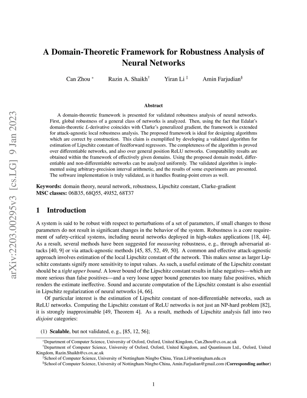 A domain-theoretic framework is presented for validated robustness analysis of neural networks. First, global robustness of a general class of networks is analyzed. Then, using the fact that Edalat's domain-theoretic L-derivative coincides with Clarke's generalized gradient, the framework is extended for attack-agnostic local robustness analysis. The proposed framework is ideal for designing algorithms which are correct by construction. This claim is exemplified by developing a validated algorithm for estimation of Lipschitz constant of feedforward regressors. The completeness of the algorithm is proved over differentiable networks, and also over general position ReLU networks. Computability results are obtained within the framework of effectively given domains. Using the proposed domain model, differentiable and non-differentiable networks can be analyzed uniformly. The validated algorithm is implemented using arbitrary-precision interval arithmetic, and the results of some experiments are presented. The software implementation is truly validated, as it handles floating-point errors as well.