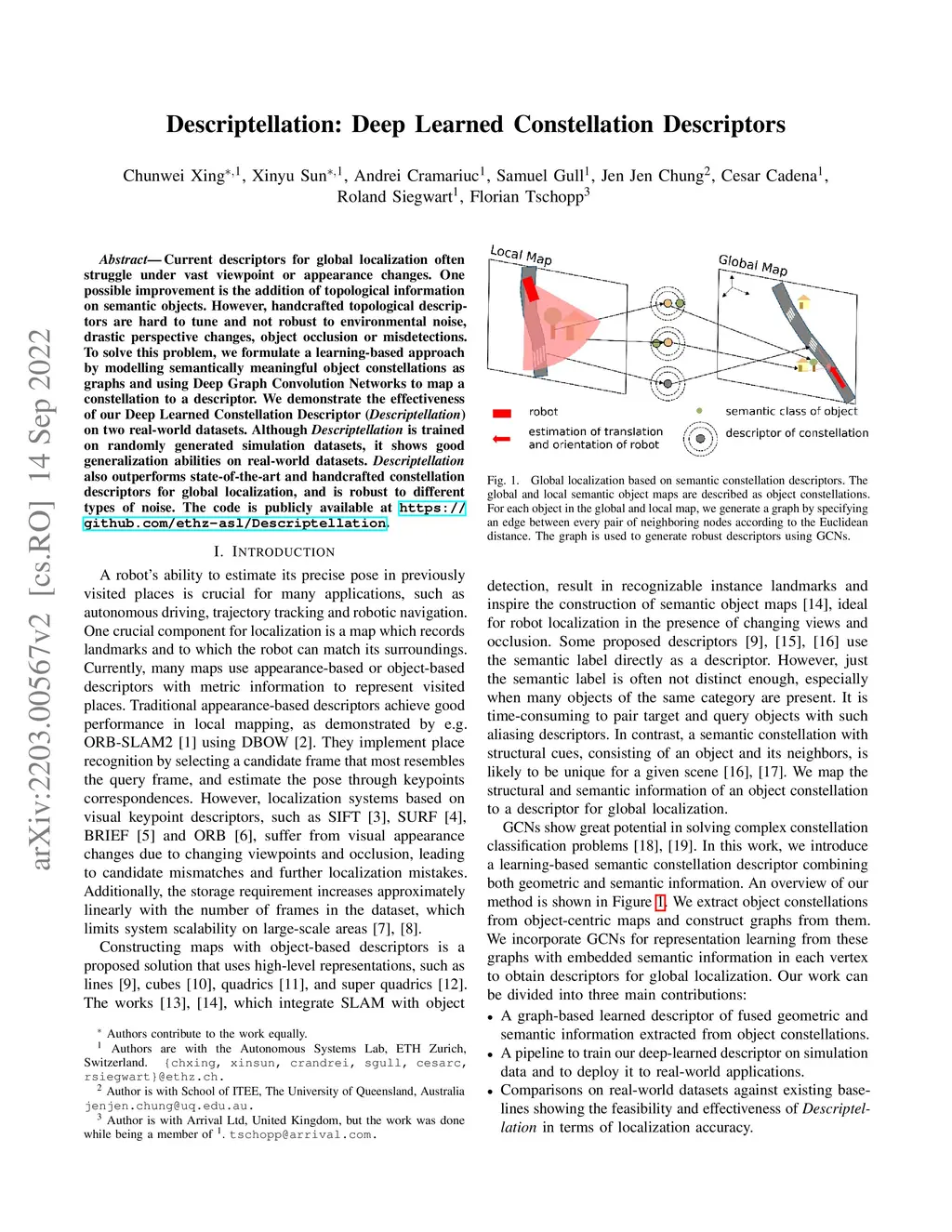 Current descriptors for global localization often struggle under vast viewpoint or appearance changes. One possible improvement is the addition of topological information on semantic objects. However, handcrafted topological descriptors are hard to tune and not robust to environmental noise, drastic perspective changes, object occlusion or misdetections. To solve this problem, we formulate a learning-based approach by modelling semantically meaningful object constellations as graphs and using Deep Graph Convolution Networks to map a constellation to a descriptor. We demonstrate the effectiveness of our Deep Learned Constellation Descriptor (Descriptellation) on two real-world datasets. Although Descriptellation is trained on randomly generated simulation datasets, it shows good generalization abilities on real-world datasets. Descriptellation also outperforms state-of-the-art and handcrafted constellation descriptors for global localization, and is robust to different types of noise. The code is publicly available at https://github.com/ethz-asl/Descriptellation.