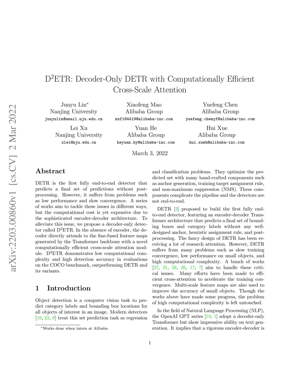 DETR is the first fully end-to-end detector that predicts a final set of predictions without post-processing. However, it suffers from problems such as low performance and slow convergence. A series of works aim to tackle these issues in different ways, but the computational cost is yet expensive due to the sophisticated encoder-decoder architecture. To alleviate this issue, we propose a decoder-only detector called D^2ETR. In the absence of encoder, the decoder directly attends to the fine-fused feature maps generated by the Transformer backbone with a novel computationally efficient cross-scale attention module. D^2ETR demonstrates low computational complexity and high detection accuracy in evaluations on the COCO benchmark, outperforming DETR and its variants.