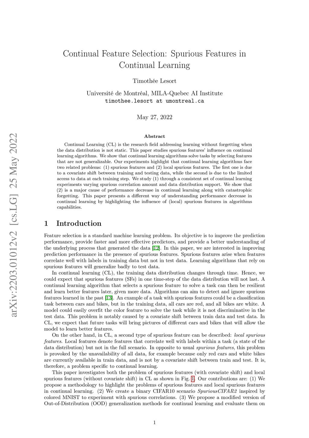 Continual Learning (CL) is the research field addressing learning without forgetting when the data distribution is not static. This paper studies spurious features' influence on continual learning algorithms. We show that continual learning algorithms solve tasks by selecting features that are not generalizable. Our experiments highlight that continual learning algorithms face two related problems: (1) spurious features and (2) local spurious features. The first one is due to a covariate shift between training and testing data, while the second is due to the limited access to data at each training step. We study (1) through a consistent set of continual learning experiments varying spurious correlation amount and data distribution support. We show that (2) is a major cause of performance decrease in continual learning along with catastrophic forgetting. This paper presents a different way of understanding performance decrease in continual learning by highlighting the influence of (local) spurious features in algorithms capabilities.