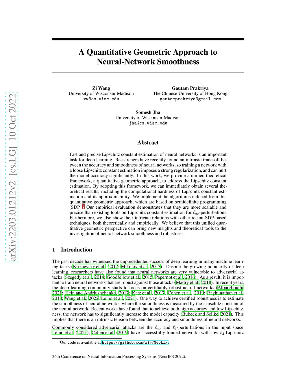 Fast and precise Lipschitz constant estimation of neural networks is an important task for deep learning. Researchers have recently found an intrinsic trade-off between the accuracy and smoothness of neural networks, so training a network with a loose Lipschitz constant estimation imposes a strong regularization and can hurt the model accuracy significantly. In this work, we provide a unified theoretical framework, a quantitative geometric approach, to address the Lipschitz constant estimation. By adopting this framework, we can immediately obtain several theoretical results, including the computational hardness of Lipschitz constant estimation and its approximability. Furthermore, the quantitative geometric perspective can also provide some insights into recent empirical observations that techniques for one norm do not usually transfer to another one. We also implement the algorithms induced from this quantitative geometric approach in a tool GeoLIP. These algorithms are based on semidefinite programming (SDP). Our empirical evaluation demonstrates that GeoLIP is more scalable and precise than existing tools on Lipschitz constant estimation for -perturbations. Furthermore, we also show its intricate relations with other recent SDP-based techniques, both theoretically and empirically. We believe that this unified quantitative geometric perspective can bring new insights and theoretical tools to the investigation of neural-network smoothness and robustness.