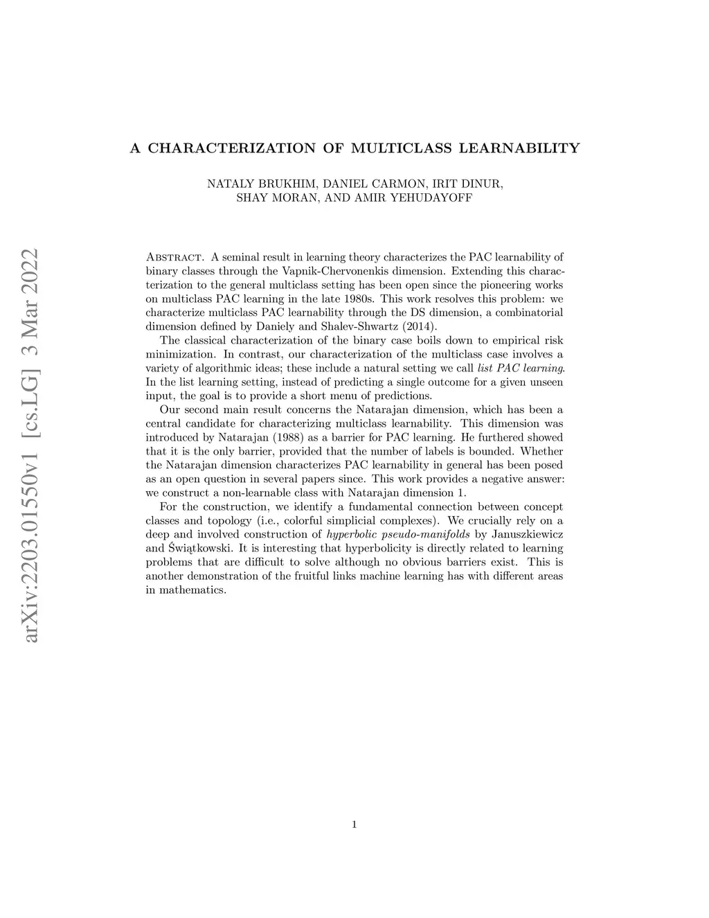 A seminal result in learning theory characterizes the PAC learnability of binary classes through the Vapnik-Chervonenkis dimension. Extending this characterization to the general multiclass setting has been open since the pioneering works on multiclass PAC learning in the late 1980s. This work resolves this problem: we characterize multiclass PAC learnability through the DS dimension, a combinatorial dimension defined by Daniely and Shalev-Shwartz (2014). The classical characterization of the binary case boils down to empirical risk minimization. In contrast, our characterization of the multiclass case involves a variety of algorithmic ideas; these include a natural setting we call list PAC learning. In the list learning setting, instead of predicting a single outcome for a given unseen input, the goal is to provide a short menu of predictions. Our second main result concerns the Natarajan dimension, which has been a central candidate for characterizing multiclass learnability. This dimension was introduced by Natarajan (1988) as a barrier for PAC learning. Whether the Natarajan dimension characterizes PAC learnability in general has been posed as an open question in several papers since. This work provides a negative answer: we construct a non-learnable class with Natarajan dimension one. For the construction, we identify a fundamental connection between concept classes and topology (i.e., colorful simplicial complexes). We crucially rely on a deep and involved construction of hyperbolic pseudo-manifolds by Januszkiewicz and Swiatkowski. It is interesting that hyperbolicity is directly related to learning problems that are difficult to solve although no obvious barriers exist. This is another demonstration of the fruitful links machine learning has with different areas in mathematics.