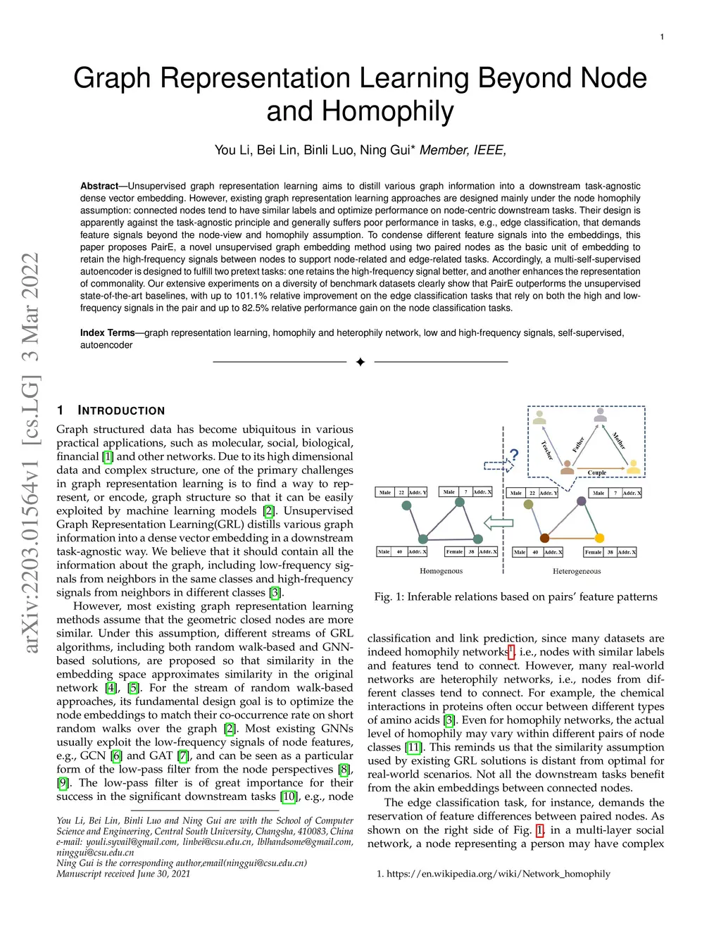 Unsupervised graph representation learning aims to distill various graph information into a downstream task-agnostic dense vector embedding. However, existing graph representation learning approaches are designed mainly under the node homophily assumption: connected nodes tend to have similar labels and optimize performance on node-centric downstream tasks. Their design is apparently against the task-agnostic principle and generally suffers poor performance in tasks, e.g., edge classification, that demands feature signals beyond the node-view and homophily assumption. To condense different feature signals into the embeddings, this paper proposes PairE, a novel unsupervised graph embedding method using two paired nodes as the basic unit of embedding to retain the high-frequency signals between nodes to support node-related and edge-related tasks. Accordingly, a multi-self-supervised autoencoder is designed to fulfill two pretext tasks: one retains the high-frequency signal better, and another enhances the representation of commonality. Our extensive experiments on a diversity of benchmark datasets clearly show that PairE outperforms the unsupervised state-of-the-art baselines, with up to 101.1\% relative improvement on the edge classification tasks that rely on both the high and low-frequency signals in the pair and up to 82.5\% relative performance gain on the node classification tasks.