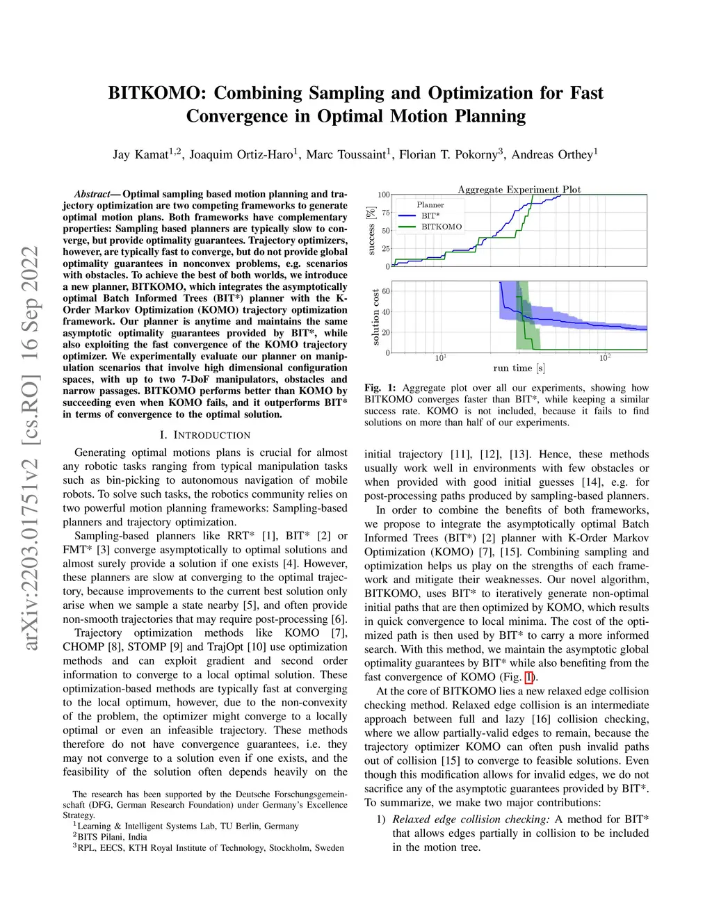 Optimal sampling based motion planning and trajectory optimization are two competing frameworks to generate optimal motion plans. Both frameworks have complementary properties: Sampling based planners are typically slow to converge, but provide optimality guarantees. Trajectory optimizers, however, are typically fast to converge, but do not provide global optimality guarantees in nonconvex problems, e.g. scenarios with obstacles. To achieve the best of both worlds, we introduce a new planner, BITKOMO, which integrates the asymptotically optimal Batch Informed Trees (BIT*) planner with the K-Order Markov Optimization (KOMO) trajectory optimization framework. Our planner is anytime and maintains the same asymptotic optimality guarantees provided by BIT*, while also exploiting the fast convergence of the KOMO trajectory optimizer. We experimentally evaluate our planner on manipulation scenarios that involve high dimensional configuration spaces, with up to two 7-DoF manipulators, obstacles and narrow passages. BITKOMO performs better than KOMO by succeeding even when KOMO fails, and it outperforms BIT* in terms of convergence to the optimal solution.