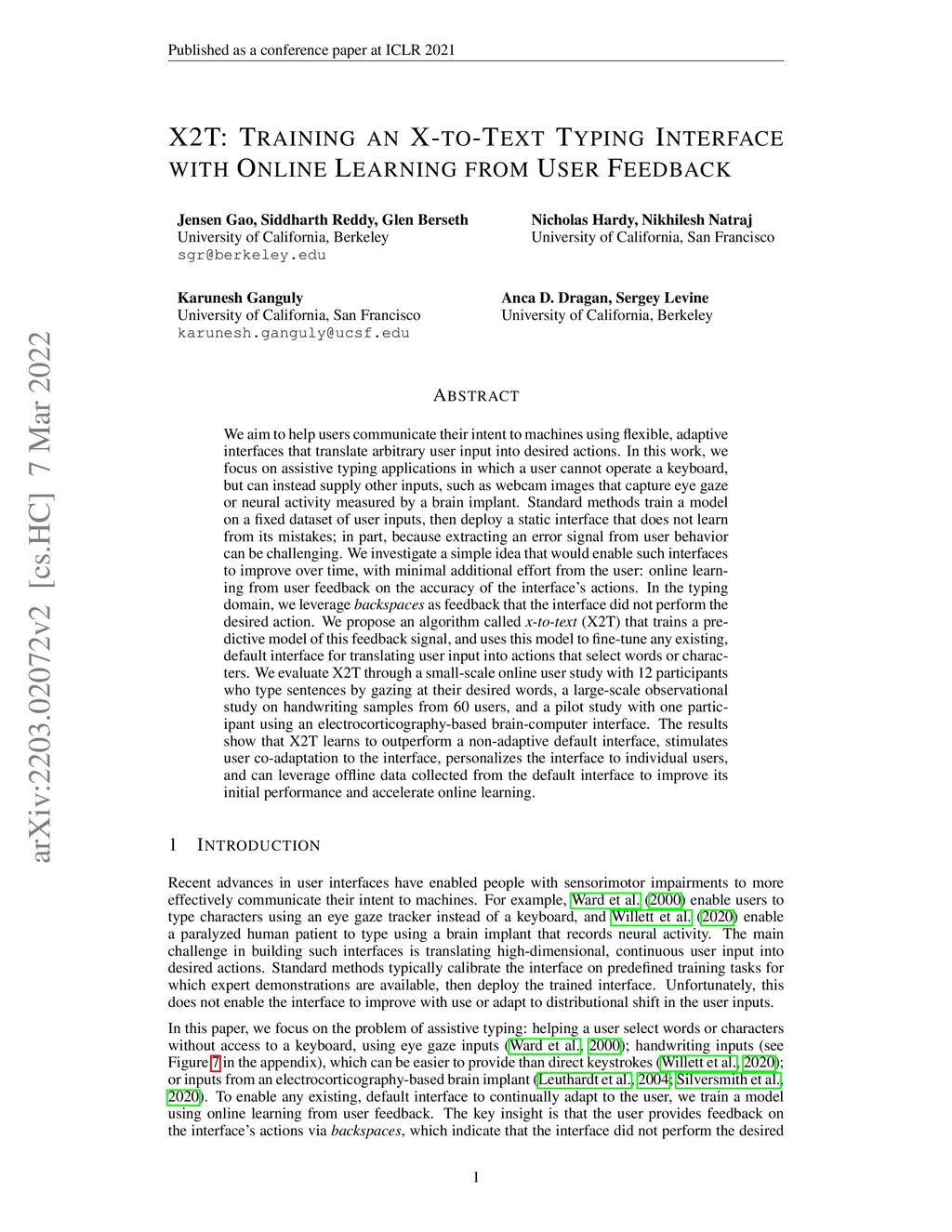 We aim to help users communicate their intent to machines using flexible, adaptive interfaces that translate arbitrary user input into desired actions. In this work, we focus on assistive typing applications in which a user cannot operate a keyboard, but can instead supply other inputs, such as webcam images that capture eye gaze or neural activity measured by a brain implant. Standard methods train a model on a fixed dataset of user inputs, then deploy a static interface that does not learn from its mistakes; in part, because extracting an error signal from user behavior can be challenging. We investigate a simple idea that would enable such interfaces to improve over time, with minimal additional effort from the user: online learning from user feedback on the accuracy of the interface's actions. In the typing domain, we leverage backspaces as feedback that the interface did not perform the desired action. We propose an algorithm called x-to-text (X2T) that trains a predictive model of this feedback signal, and uses this model to fine-tune any existing, default interface for translating user input into actions that select words or characters. We evaluate X2T through a small-scale online user study with 12 participants who type sentences by gazing at their desired words, a large-scale observational study on handwriting samples from 60 users, and a pilot study with one participant using an electrocorticography-based brain-computer interface. The results show that X2T learns to outperform a non-adaptive default interface, stimulates user co-adaptation to the interface, personalizes the interface to individual users, and can leverage offline data collected from the default interface to improve its initial performance and accelerate online learning.