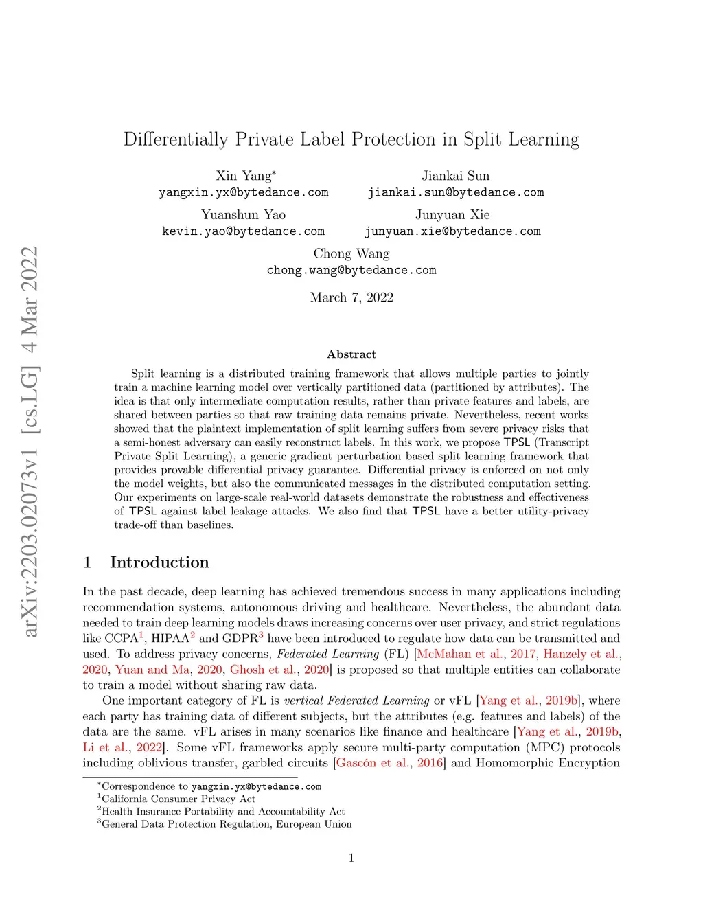 Split learning is a distributed training framework that allows multiple parties to jointly train a machine learning model over vertically partitioned data (partitioned by attributes). The idea is that only intermediate computation results, rather than private features and labels, are shared between parties so that raw training data remains private. Nevertheless, recent works showed that the plaintext implementation of split learning suffers from severe privacy risks that a semi-honest adversary can easily reconstruct labels. In this work, we propose \textsf{TPSL} (Transcript Private Split Learning), a generic gradient perturbation based split learning framework that provides provable differential privacy guarantee. Differential privacy is enforced on not only the model weights, but also the communicated messages in the distributed computation setting. Our experiments on large-scale real-world datasets demonstrate the robustness and effectiveness of \textsf{TPSL} against label leakage attacks. We also find that \textsf{TPSL} have a better utility-privacy trade-off than baselines.