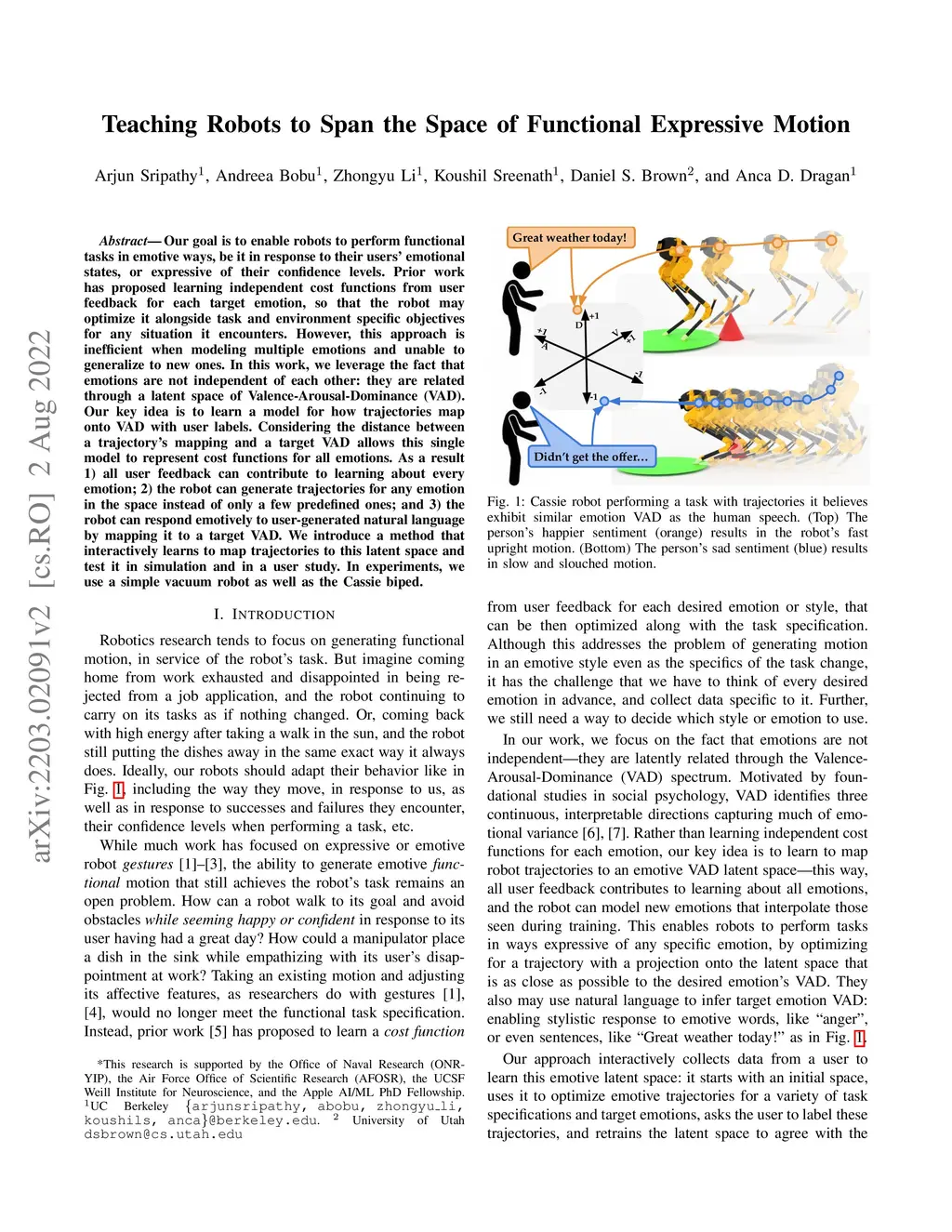 Our goal is to enable robots to perform functional tasks in emotive ways, be it in response to their users' emotional states, or expressive of their confidence levels. Prior work has proposed learning independent cost functions from user feedback for each target emotion, so that the robot may optimize it alongside task and environment specific objectives for any situation it encounters. However, this approach is inefficient when modeling multiple emotions and unable to generalize to new ones. In this work, we leverage the fact that emotions are not independent of each other: they are related through a latent space of Valence-Arousal-Dominance (VAD). Our key idea is to learn a model for how trajectories map onto VAD with user labels. Considering the distance between a trajectory's mapping and a target VAD allows this single model to represent cost functions for all emotions. As a result 1) all user feedback can contribute to learning about every emotion; 2) the robot can generate trajectories for any emotion in the space instead of only a few predefined ones; and 3) the robot can respond emotively to user-generated natural language by mapping it to a target VAD. We introduce a method that interactively learns to map trajectories to this latent space and test it in simulation and in a user study. In experiments, we use a simple vacuum robot as well as the Cassie biped.