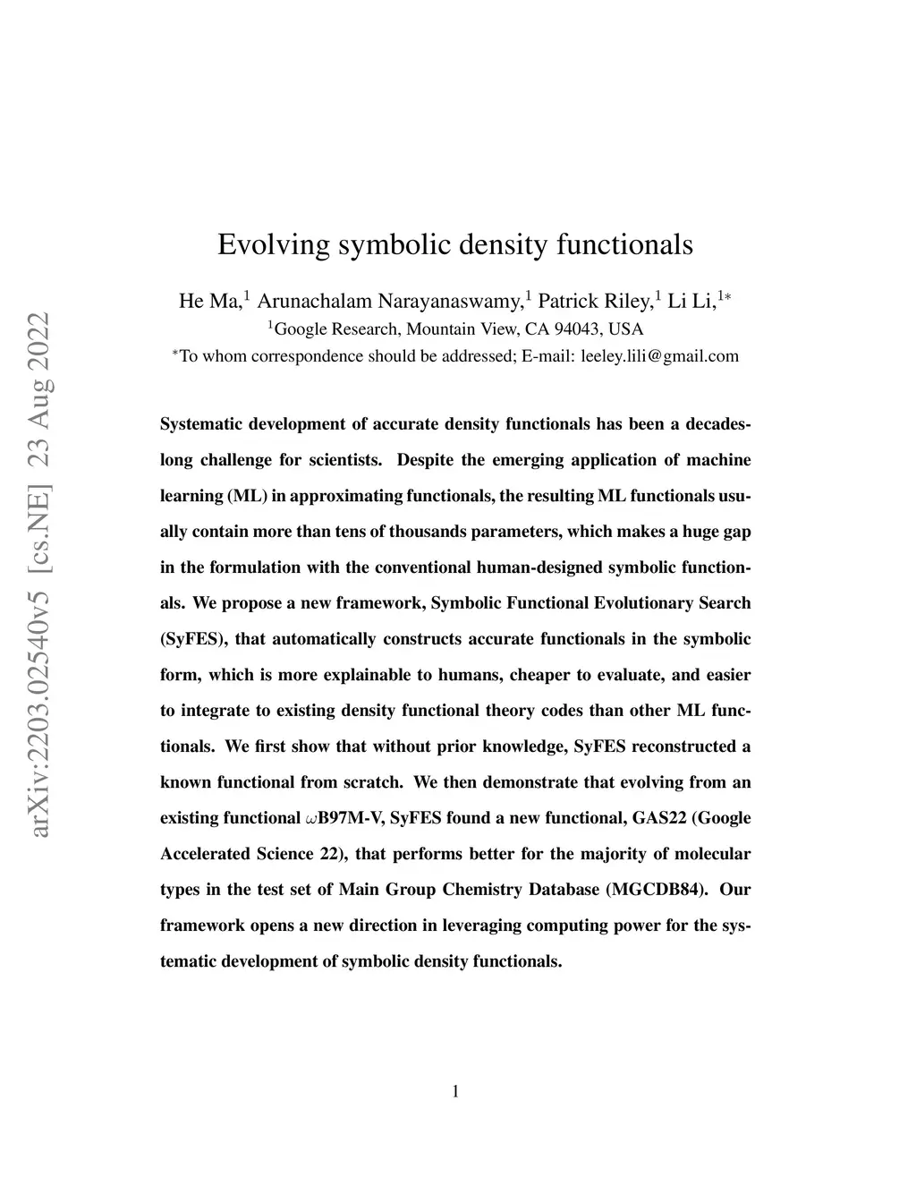 Systematic development of accurate density functionals has been a decades-long challenge for scientists. Despite the emerging application of machine learning (ML) in approximating functionals, the resulting ML functionals usually contain more than tens of thousands parameters, which makes a huge gap in the formulation with the conventional human-designed symbolic functionals. We propose a new framework, Symbolic Functional Evolutionary Search (SyFES), that automatically constructs accurate functionals in the symbolic form, which is more explainable to humans, cheaper to evaluate, and easier to integrate to existing density functional theory codes than other ML functionals. We first show that without prior knowledge, SyFES reconstructed a known functional from scratch. We then demonstrate that evolving from an existing functional B97M-V, SyFES found a new functional, GAS22 (Google Accelerated Science 22), that performs better for the majority of molecular types in the test set of Main Group Chemistry Database (MGCDB84). Our framework opens a new direction in leveraging computing power for the systematic development of symbolic density functionals.