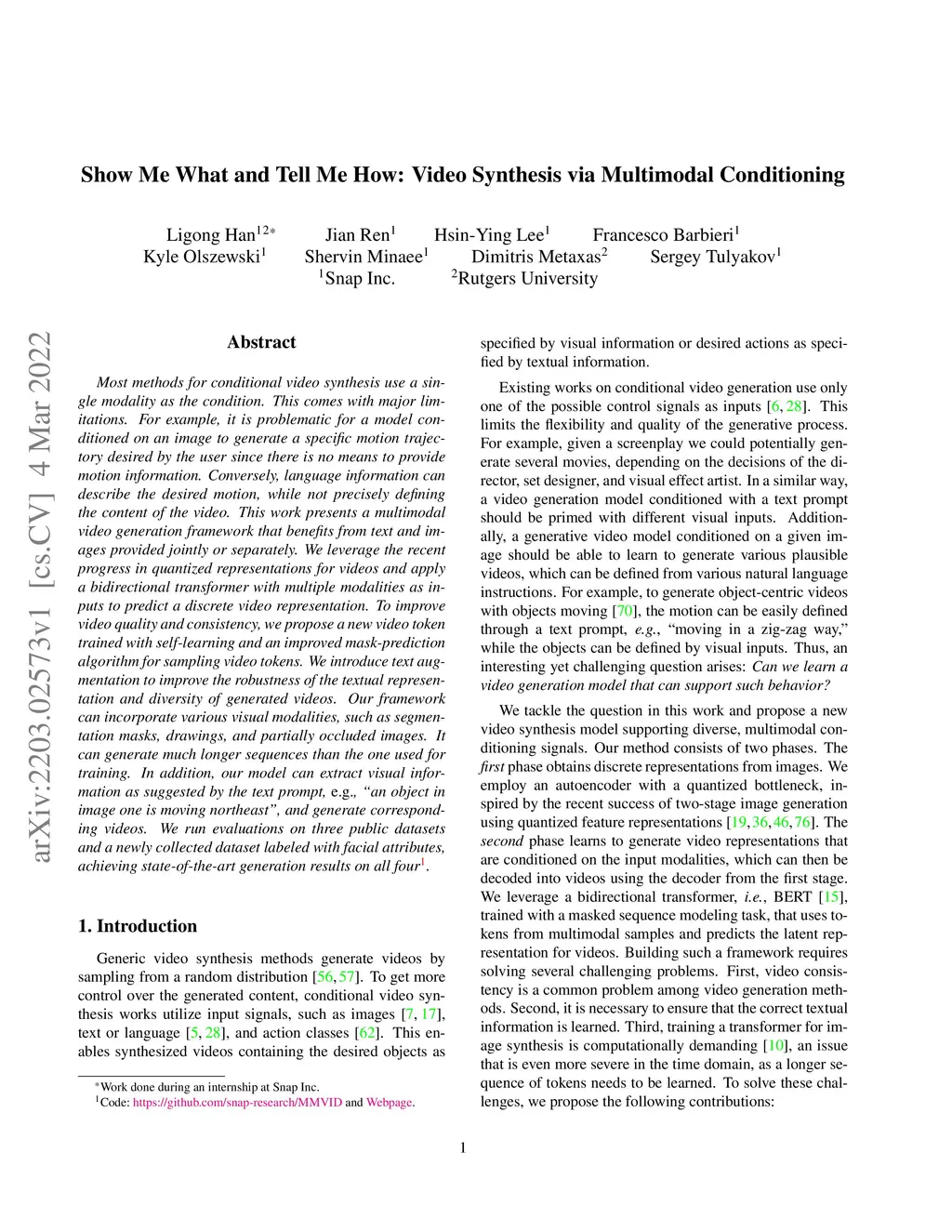 Most methods for conditional video synthesis use a single modality as the condition. This comes with major limitations. For example, it is problematic for a model conditioned on an image to generate a specific motion trajectory desired by the user since there is no means to provide motion information. Conversely, language information can describe the desired motion, while not precisely defining the content of the video. This work presents a multimodal video generation framework that benefits from text and images provided jointly or separately. We leverage the recent progress in quantized representations for videos and apply a bidirectional transformer with multiple modalities as inputs to predict a discrete video representation. To improve video quality and consistency, we propose a new video token trained with self-learning and an improved mask-prediction algorithm for sampling video tokens. We introduce text augmentation to improve the robustness of the textual representation and diversity of generated videos. Our framework can incorporate various visual modalities, such as segmentation masks, drawings, and partially occluded images. It can generate much longer sequences than the one used for training. In addition, our model can extract visual information as suggested by the text prompt, e.g., "an object in image one is moving northeast", and generate corresponding videos. We run evaluations on three public datasets and a newly collected dataset labeled with facial attributes, achieving state-of-the-art generation results on all four.