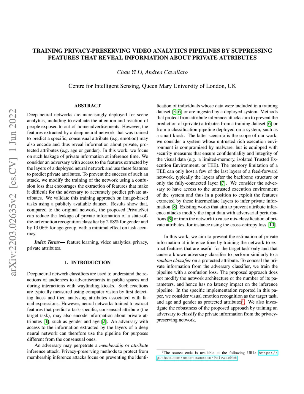 Deep neural networks are increasingly deployed for scene analytics, including to evaluate the attention and reaction of people exposed to out-of-home advertisements. However, the features extracted by a deep neural network that was trained to predict a specific, consensual attribute (e.g. emotion) may also encode and thus reveal information about private, protected attributes (e.g. age or gender). In this work, we focus on such leakage of private information at inference time. We consider an adversary with access to the features extracted by the layers of a deployed neural network and use these features to predict private attributes. To prevent the success of such an attack, we modify the training of the network using a confusion loss that encourages the extraction of features that make it difficult for the adversary to accurately predict private attributes. We validate this training approach on image-based tasks using a publicly available dataset. Results show that, compared to the original network, the proposed PrivateNet can reduce the leakage of private information of a state-of-the-art emotion recognition classifier by 2.88% for gender and by 13.06% for age group, with a minimal effect on task accuracy.