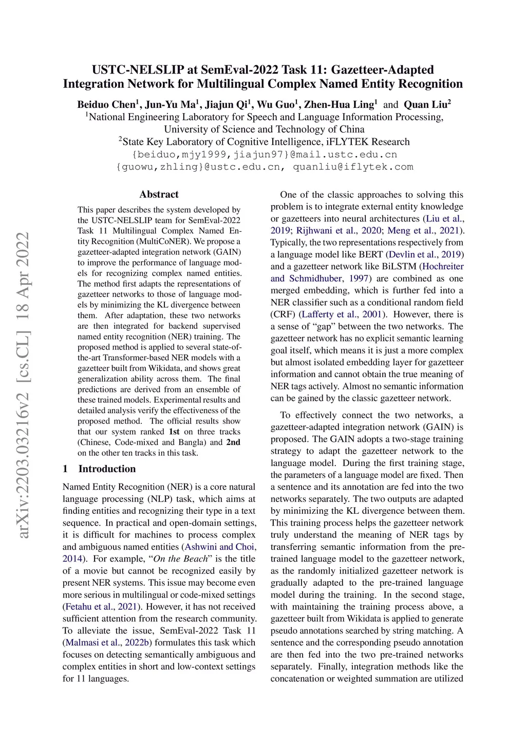 USTC-NELSLIP at SemEval-2022 Task 11: Gazetteer-Adapted Integration