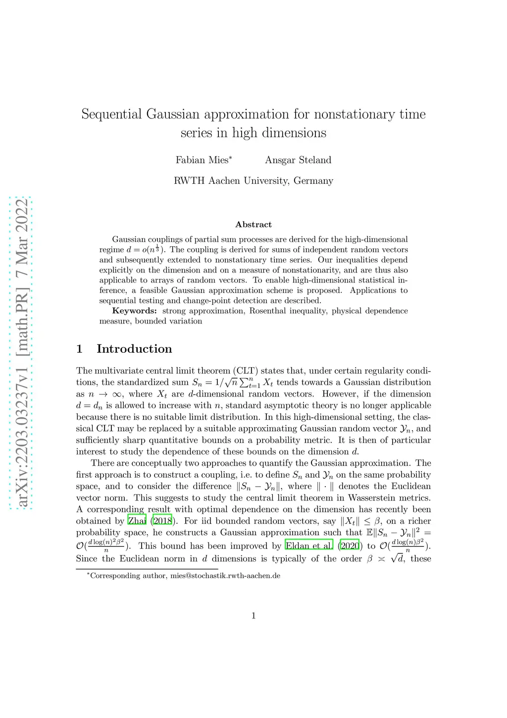 Gaussian couplings of partial sum processes are derived for the high-dimensional regime . The coupling is derived for sums of independent random vectors and subsequently extended to nonstationary time series. Our inequalities depend explicitly on the dimension and on a measure of nonstationarity, and are thus also applicable to arrays of random vectors. To enable high-dimensional statistical inference, a feasible Gaussian approximation scheme is proposed. Applications to sequential testing and change-point detection are described.