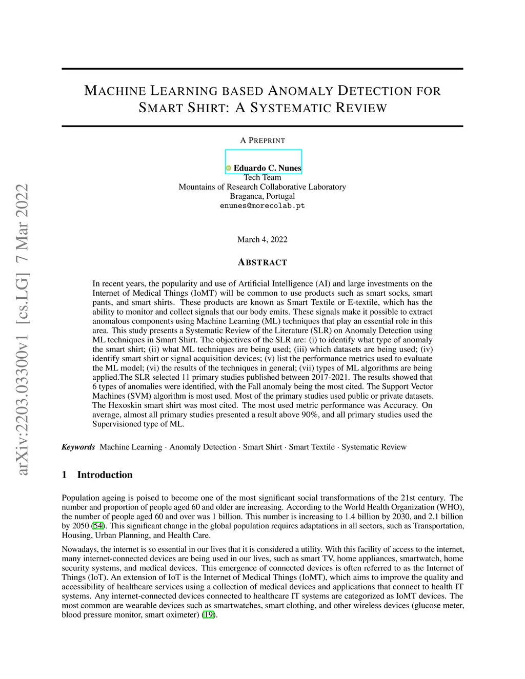 In recent years, the popularity and use of Artificial Intelligence (AI) and large investments on theInternet of Medical Things (IoMT) will be common to use products such as smart socks, smartpants, and smart shirts. These products are known as Smart Textile or E-textile, which has theability to monitor and collect signals that our body emits. These signals make it possible to extractanomalous components using Machine Learning (ML) techniques that play an essential role in thisarea. This study presents a Systematic Review of the Literature (SLR) on Anomaly Detection usingML techniques in Smart Shirt. The objectives of the SLR are: (i) to identify what type of anomalythe smart shirt; (ii) what ML techniques are being used; (iii) which datasets are being used; (iv)identify smart shirt or signal acquisition devices; (v) list the performance metrics used to evaluatethe ML model; (vi) the results of the techniques in general; (vii) types of ML algorithms are beingapplied.The SLR selected 11 primary studies published between 2017-2021. The results showed that6 types of anomalies were identified, with the Fall anomaly being the most cited. The Support VectorMachines (SVM) algorithm is most used. Most of the primary studies used public or private datasets.The Hexoskin smart shirt was most cited. The most used metric performance was Accuracy. Onaverage, almost all primary studies presented a result above 90%, and all primary studies used theSupervisioned type of ML.