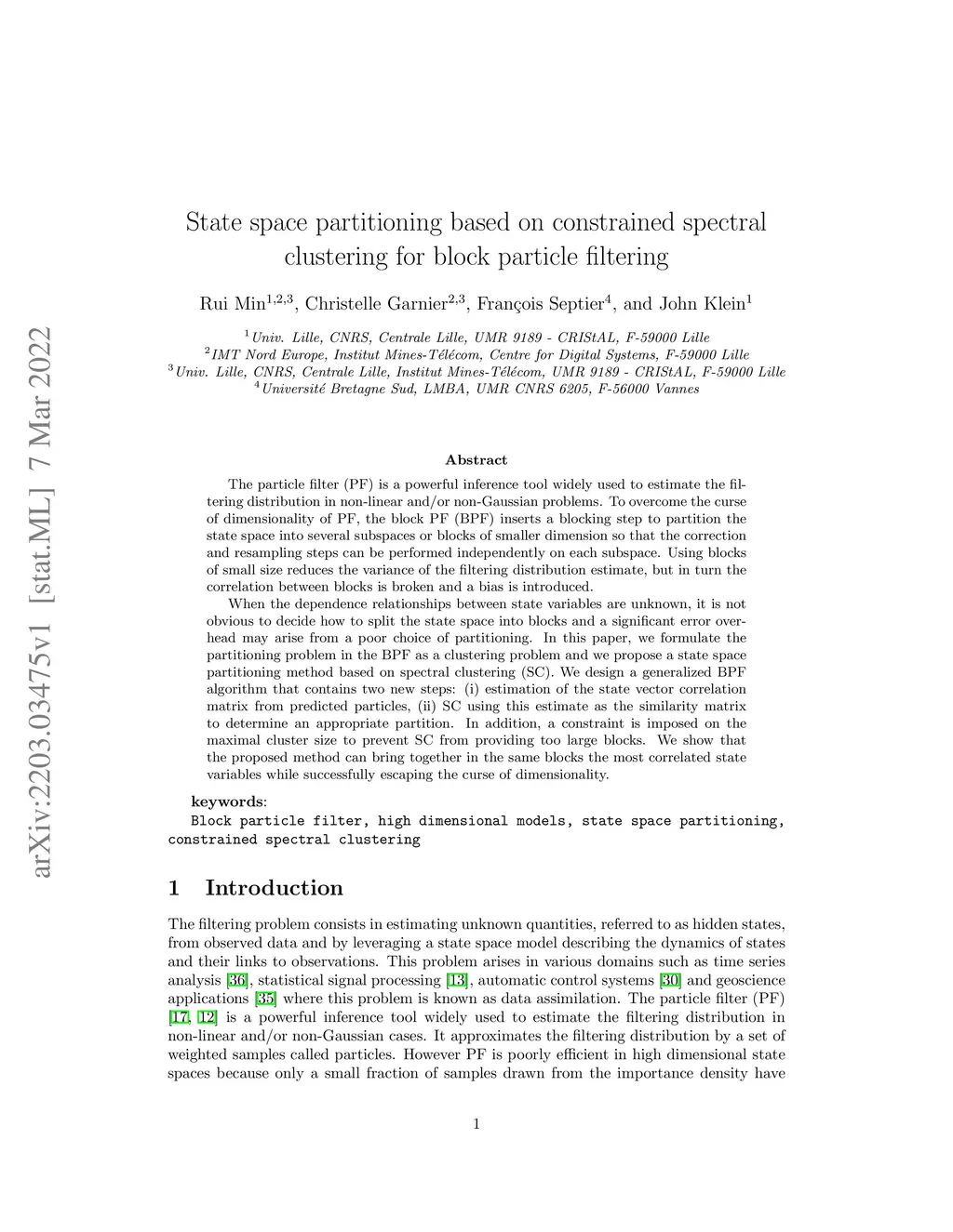 The particle filter (PF) is a powerful inference tool widely used to estimate the filtering distribution in non-linear and/or non-Gaussian problems. To overcome the curse of dimensionality of PF, the block PF (BPF) inserts a blocking step to partition the state space into several subspaces or blocks of smaller dimension so that the correction and resampling steps can be performed independently on each subspace. Using blocks of small size reduces the variance of the filtering distribution estimate, but in turn the correlation between blocks is broken and a bias is introduced. When the dependence relationships between state variables are unknown, it is not obvious to decide how to split the state space into blocks and a significant error overhead may arise from a poor choice of partitioning. In this paper, we formulate the partitioning problem in the BPF as a clustering problem and we propose a state space partitioning method based on spectral clustering (SC). We design a generalized BPF algorithm that contains two new steps: (i) estimation of the state vector correlation matrix from predicted particles, (ii) SC using this estimate as the similarity matrix to determine an appropriate partition. In addition, a constraint is imposed on the maximal cluster size to prevent SC from providing too large blocks. We show that the proposed method can bring together in the same blocks the most correlated state variables while successfully escaping the curse of dimensionality.