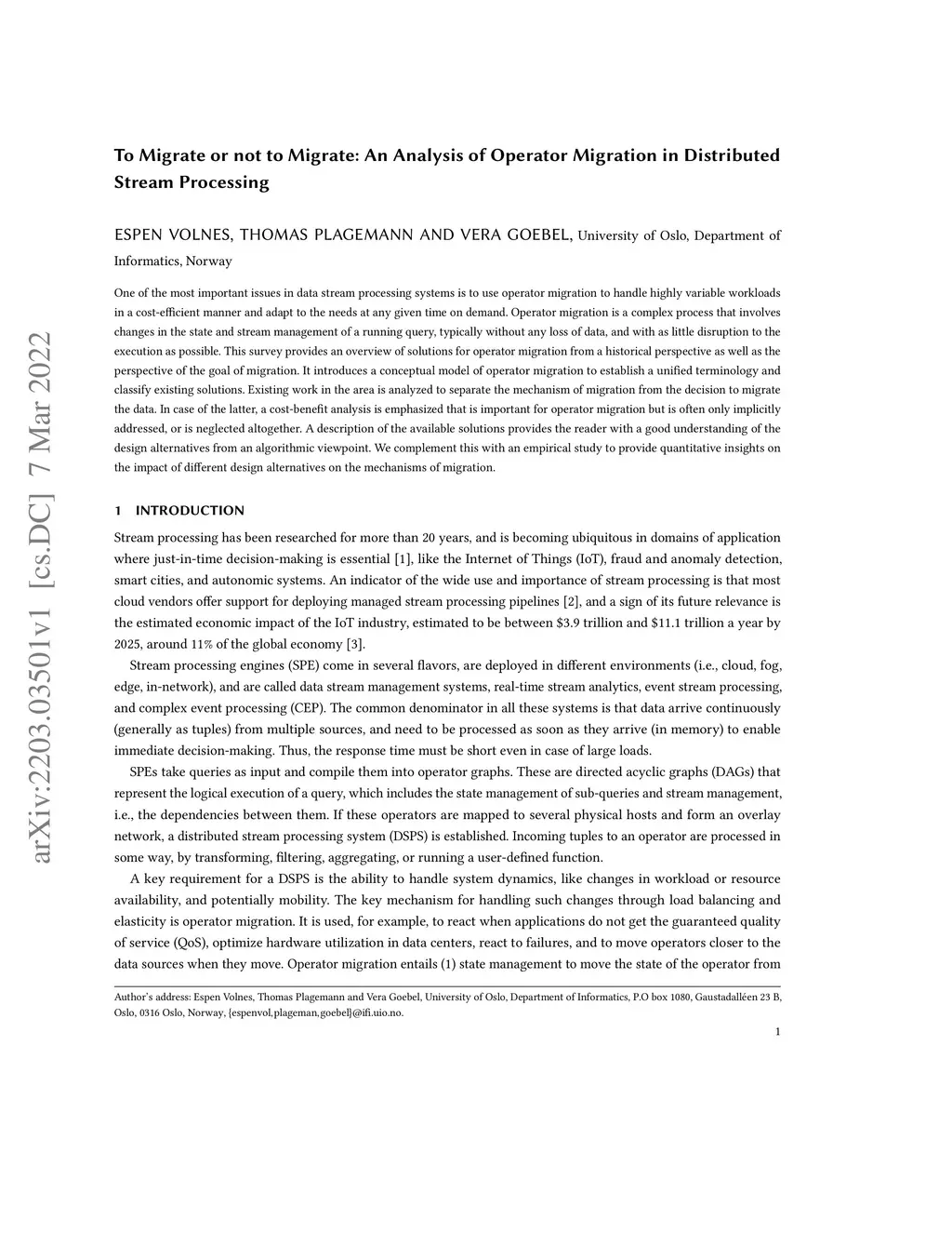 One of the most important issues in data stream processing systems is to use operator migration to handle highly variable workloads in a cost-efficient manner and adapt to the needs at any given time on demand. Operator migration is a complex process that involves changes in the state and stream management of a running query, typically without any loss of data, and with as little disruption to the execution as possible. This survey provides an overview of solutions for operator migration from a historical perspective as well as the perspective of the goal of migration. It introduces a conceptual model of operator migration to establish a unified terminology and classify existing solutions. Existing work in the area is analyzed to separate the mechanism of migration from the decision to migrate the data. In case of the latter, a cost-benefit analysis is emphasized that is important for operator migration but is often only implicitly addressed, or is neglected altogether. A description of the available solutions provides the reader with a good understanding of the design alternatives from an algorithmic viewpoint. We complement this with an empirical study to provide quantitative insights on the impact of different design alternatives on the mechanisms of migration.