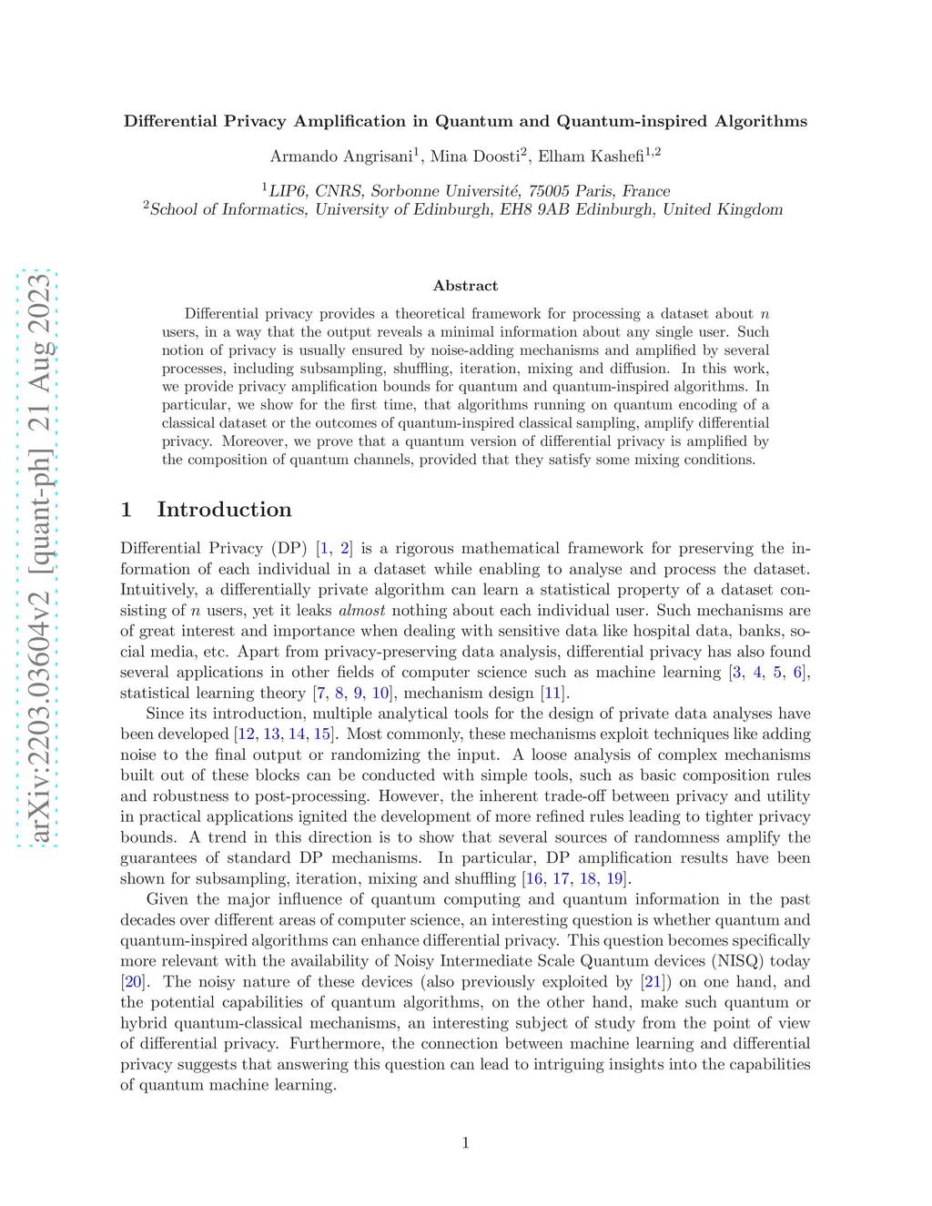 Differential privacy provides a theoretical framework for processing a dataset about users, in a way that the output reveals a minimal information about any single user. Such notion of privacy is usually ensured by noise-adding mechanisms and amplified by several processes, including subsampling, shuffling, iteration, mixing and diffusion. In this work, we provide privacy amplification bounds for quantum and quantum-inspired algorithms. In particular, we show for the first time, that algorithms running on quantum encoding of a classical dataset or the outcomes of quantum-inspired classical sampling, amplify differential privacy. Moreover, we prove that a quantum version of differential privacy is amplified by the composition of quantum channels, provided that they satisfy some mixing conditions.
