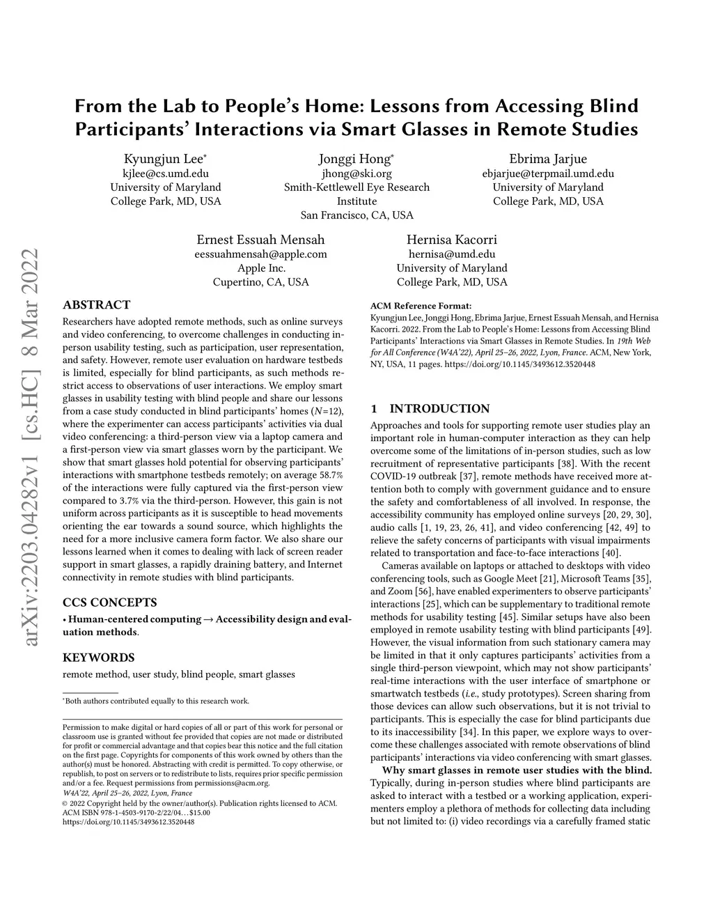 Researchers have adopted remote methods, such as online surveys and video conferencing, to overcome challenges in conducting in-person usability testing, such as participation, user representation, and safety. However, remote user evaluation on hardware testbeds is limited, especially for blind participants, as such methods restrict access to observations of user interactions. We employ smart glasses in usability testing with blind people and share our lessons from a case study conducted in blind participants' homes (N=12), where the experimenter can access participants' activities via dual video conferencing: a third-person view via a laptop camera and a first-person view via smart glasses worn by the participant. We show that smart glasses hold potential for observing participants' interactions with smartphone testbeds remotely; on average 58.7% of the interactions were fully captured via the first-person view compared to 3.7% via the third-person. However, this gain is not uniform across participants as it is susceptible to head movements orienting the ear towards a sound source, which highlights the need for a more inclusive camera form factor. We also share our lessons learned when it comes to dealing with lack of screen reader support in smart glasses, a rapidly draining battery, and Internet connectivity in remote studies with blind participants.