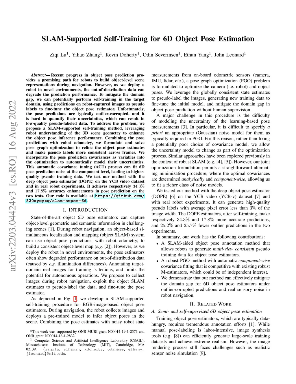 Recent progress in object pose prediction provides a promising path for robots to build object-level scene representations during navigation. However, as we deploy a robot in novel environments, the out-of-distribution data can degrade the prediction performance. To mitigate the domain gap, we can potentially perform self-training in the target domain, using predictions on robot-captured images as pseudo labels to fine-tune the object pose estimator. Unfortunately, the pose predictions are typically outlier-corrupted, and it is hard to quantify their uncertainties, which can result in low-quality pseudo-labeled data. To address the problem, we propose a SLAM-supported self-training method, leveraging robot understanding of the 3D scene geometry to enhance the object pose inference performance. Combining the pose predictions with robot odometry, we formulate and solve pose graph optimization to refine the object pose estimates and make pseudo labels more consistent across frames. We incorporate the pose prediction covariances as variables into the optimization to automatically model their uncertainties. This automatic covariance tuning (ACT) process can fit 6D pose prediction noise at the component level, leading to higher-quality pseudo training data. We test our method with the deep object pose estimator (DOPE) on the YCB video dataset and in real robot experiments. It achieves respectively 34.3% and 17.8% accuracy enhancements in pose prediction on the two tests. Our code is available at https://github.com/520xyxyzq/slam-super-6d.