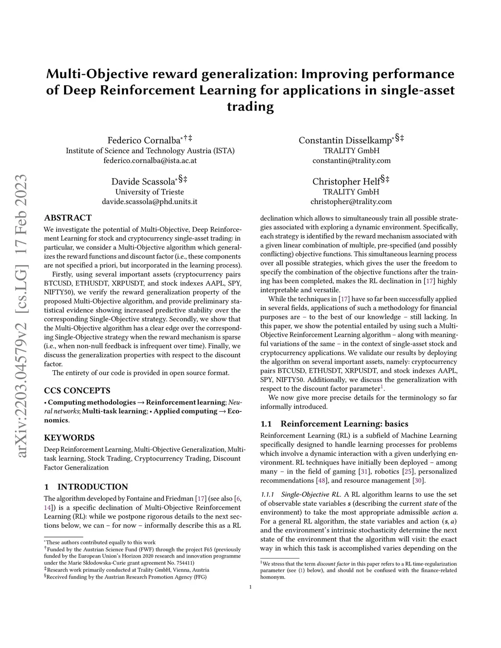 We investigate the potential of Multi-Objective, Deep Reinforcement Learning for stock and cryptocurrency single-asset trading: in particular, we consider a Multi-Objective algorithm which generalizes the reward functions and discount factor (i.e., these components are not specified a priori, but incorporated in the learning process). Firstly, using several important assets (cryptocurrency pairs BTCUSD, ETHUSDT, XRPUSDT, and stock indexes AAPL, SPY, NIFTY50), we verify the reward generalization property of the proposed Multi-Objective algorithm, and provide preliminary statistical evidence showing increased predictive stability over the corresponding Single-Objective strategy. Secondly, we show that the Multi-Objective algorithm has a clear edge over the corresponding Single-Objective strategy when the reward mechanism is sparse (i.e., when non-null feedback is infrequent over time). Finally, we discuss the generalization properties with respect to the discount factor. The entirety of our code is provided in open source format.