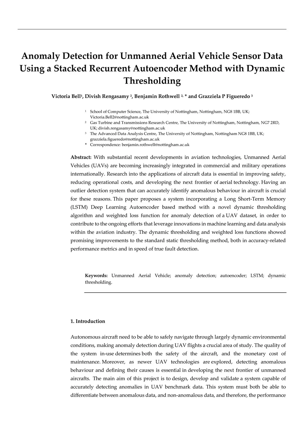 With substantial recent developments in aviation technologies, Unmanned Aerial Vehicles (UAVs) are becoming increasingly integrated in commercial and military operations internationally. Research into the applications of aircraft data is essential in improving safety, reducing operational costs, and developing the next frontier of aerial technology. Having an outlier detection system that can accurately identify anomalous behaviour in aircraft is crucial for these reasons. This paper proposes a system incorporating a Long Short-Term Memory (LSTM) Deep Learning Autoencoder based method with a novel dynamic thresholding algorithm and weighted loss function for anomaly detection of a UAV dataset, in order to contribute to the ongoing efforts that leverage innovations in machine learning and data analysis within the aviation industry. The dynamic thresholding and weighted loss functions showed promising improvements to the standard static thresholding method, both in accuracy-related performance metrics and in speed of true fault detection.