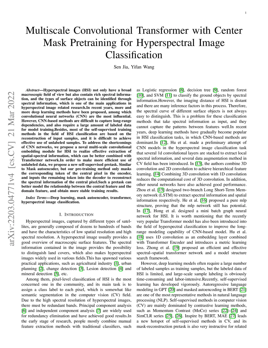 Hyperspectral images (HSI) not only have a broad macroscopic field of view but also contain rich spectral information, and the types of surface objects can be identified through spectral information, which is one of the main applications in hyperspectral image related research.In recent years, more and more deep learning methods have been proposed, among which convolutional neural networks (CNN) are the most influential. However, CNN-based methods are difficult to capture long-range dependencies, and also require a large amount of labeled data for model training.Besides, most of the self-supervised training methods in the field of HSI classification are based on the reconstruction of input samples, and it is difficult to achieve effective use of unlabeled samples. To address the shortcomings of CNN networks, we propose a noval multi-scale convolutional embedding module for HSI to realize effective extraction of spatial-spectral information, which can be better combined with Transformer network.In order to make more efficient use of unlabeled data, we propose a new self-supervised pretask. Similar to Mask autoencoder, but our pre-training method only masks the corresponding token of the central pixel in the encoder, and inputs the remaining token into the decoder to reconstruct the spectral information of the central pixel.Such a pretask can better model the relationship between the central feature and the domain feature, and obtain more stable training results.