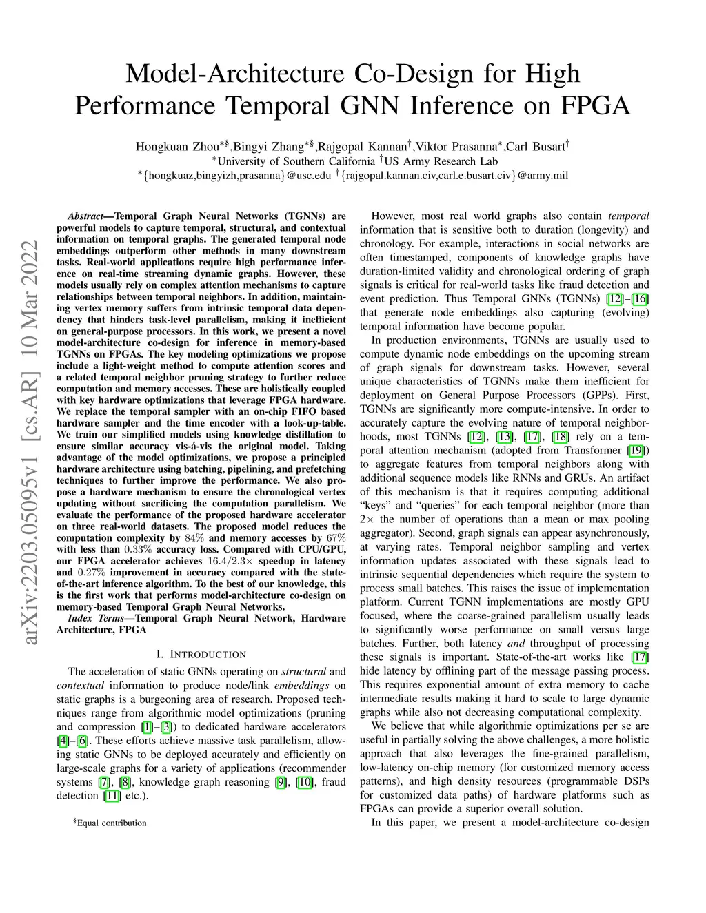 Temporal Graph Neural Networks (TGNNs) are powerful models to capture temporal, structural, and contextual information on temporal graphs. The generated temporal node embeddings outperform other methods in many downstream tasks. Real-world applications require high performance inference on real-time streaming dynamic graphs. However, these models usually rely on complex attention mechanisms to capture relationships between temporal neighbors. In addition, maintaining vertex memory suffers from intrinsic temporal data dependency that hinders task-level parallelism, making it inefficient on general-purpose processors. In this work, we present a novel model-architecture co-design for inference in memory-based TGNNs on FPGAs. The key modeling optimizations we propose include a light-weight method to compute attention scores and a related temporal neighbor pruning strategy to further reduce computation and memory accesses. These are holistically coupled with key hardware optimizations that leverage FPGA hardware. We replace the temporal sampler with an on-chip FIFO based hardware sampler and the time encoder with a look-up-table. We train our simplified models using knowledge distillation to ensure similar accuracy vis-\á-vis the original model. Taking advantage of the model optimizations, we propose a principled hardware architecture using batching, pipelining, and prefetching techniques to further improve the performance. We also propose a hardware mechanism to ensure the chronological vertex updating without sacrificing the computation parallelism. We evaluate the performance of the proposed hardware accelerator on three real-world datasets.