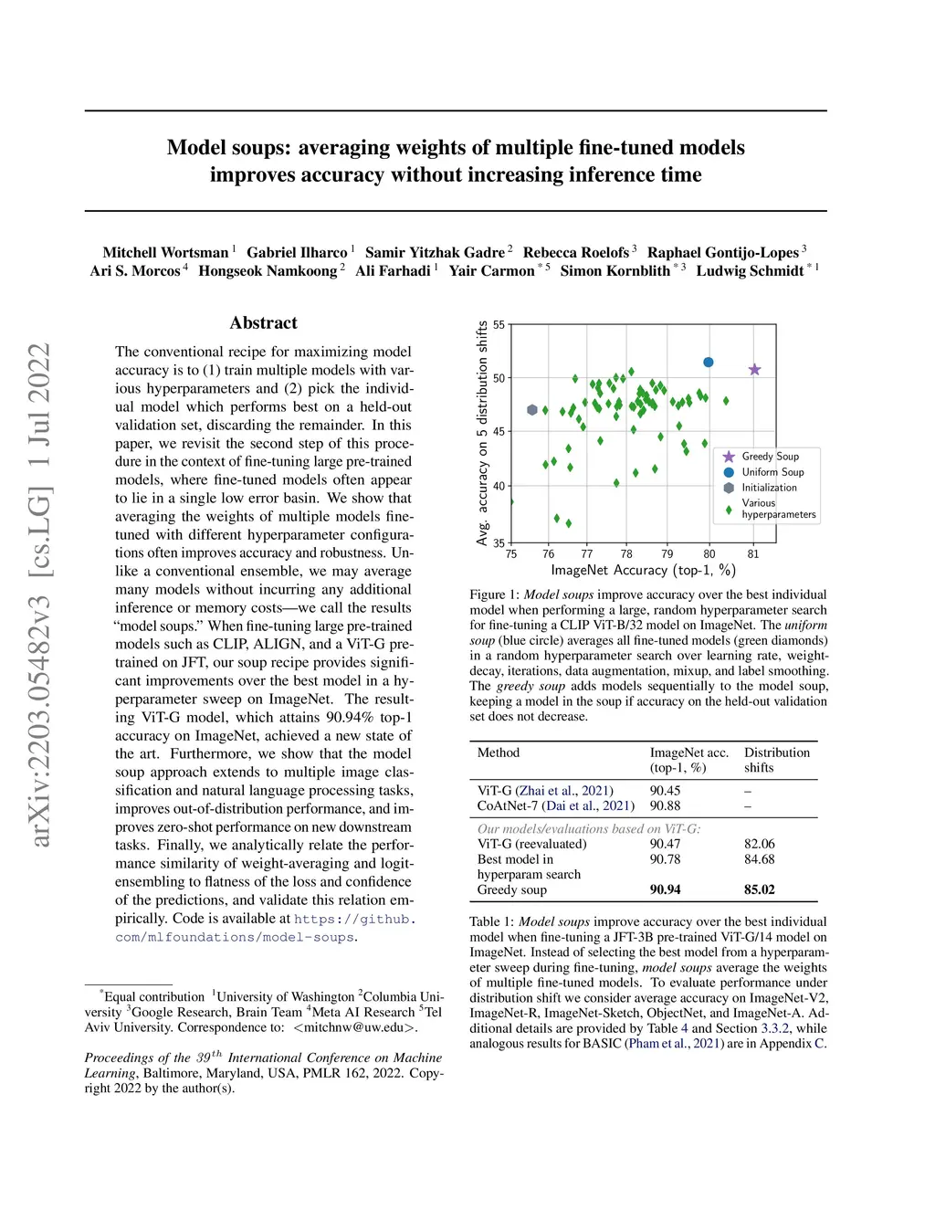 The conventional recipe for maximizing model accuracy is to (1) train multiple models with various hyperparameters and (2) pick the individual model which performs best on a held-out validation set, discarding the remainder. In this paper, we revisit the second step of this procedure in the context of fine-tuning large pre-trained models, where fine-tuned models often appear to lie in a single low error basin. We show that averaging the weights of multiple models fine-tuned with different hyperparameter configurations often improves accuracy and robustness. Unlike a conventional ensemble, we may average many models without incurring any additional inference or memory costs -- we call the results "model soups." When fine-tuning large pre-trained models such as CLIP, ALIGN, and a ViT-G pre-trained on JFT, our soup recipe provides significant improvements over the best model in a hyperparameter sweep on ImageNet. The resulting ViT-G model, which attains 90.94% top-1 accuracy on ImageNet, achieved a new state of the art. Furthermore, we show that the model soup approach extends to multiple image classification and natural language processing tasks, improves out-of-distribution performance, and improves zero-shot performance on new downstream tasks. Finally, we analytically relate the performance similarity of weight-averaging and logit-ensembling to flatness of the loss and confidence of the predictions, and validate this relation empirically. Code is available at https://github.com/mlfoundations/model-soups.