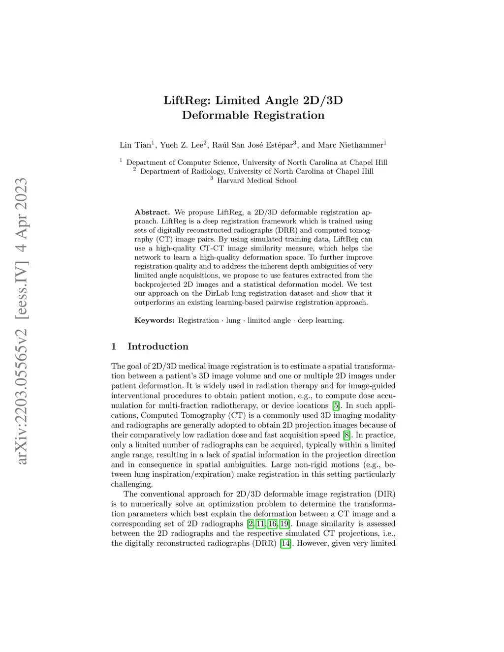 LiftReg: Limited Angle 2D/3D Deformable Registration